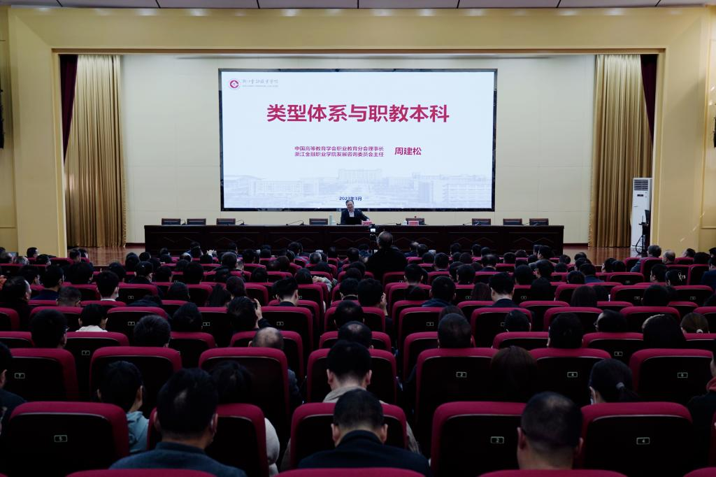 周建松阐述了类型与体系建设的内在统一性,并从职业教育体系的历史分析、党的十九大以来对职业教育体系的新谋划、加快构建现代职业教育体系、体系建设的层次定位、体系建设的焦点问题等方面进行了剖析。周建松以深圳职业技术学院、南京工业职业技术大学等院校为例,详细分析了本科层次职业教育的探索与挑战、创新与实践,从主要特点、基本框架、办学定位、治理水平、办学规模、专业设置、师资队伍、人才培养、科研与社会服务、基础设施、办学经费等核心要点,全面解读了《本科层次职业学校设置标准(试行)》,从职业本科教育的办学政策、办学定位、基本属性、人才培养体系构建的主要原则、专业与专业群建设等方面分享了关于职业本科教育人才培养体系的探索与思考,为学校高质量发展提供了十分有益的经验与启示。