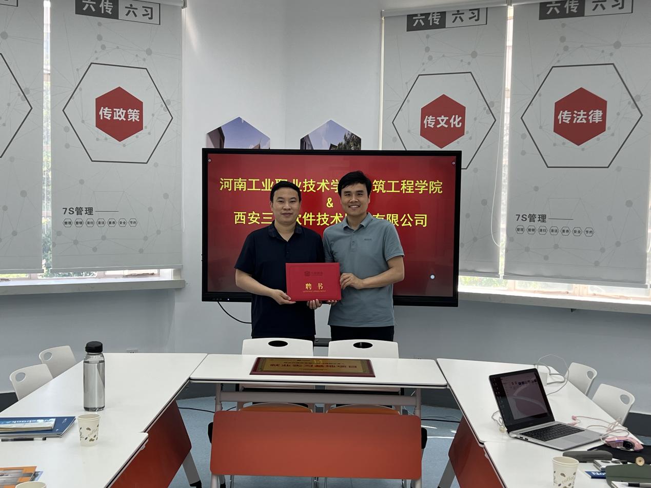 5月17日,建筑工程学院与西安三好股份有限公司在光武路校区虚拟仿真实训基地,就教育部供需对接就业育人项目举行授牌仪式。建筑工程学院院长范国辉、骨干教师刘梓、崔乃元,西安三好股份有限公司董事长张巍、区域经理闫士涵参加了授牌仪式,同时还发放了专家聘书,开展了校企合作交流。