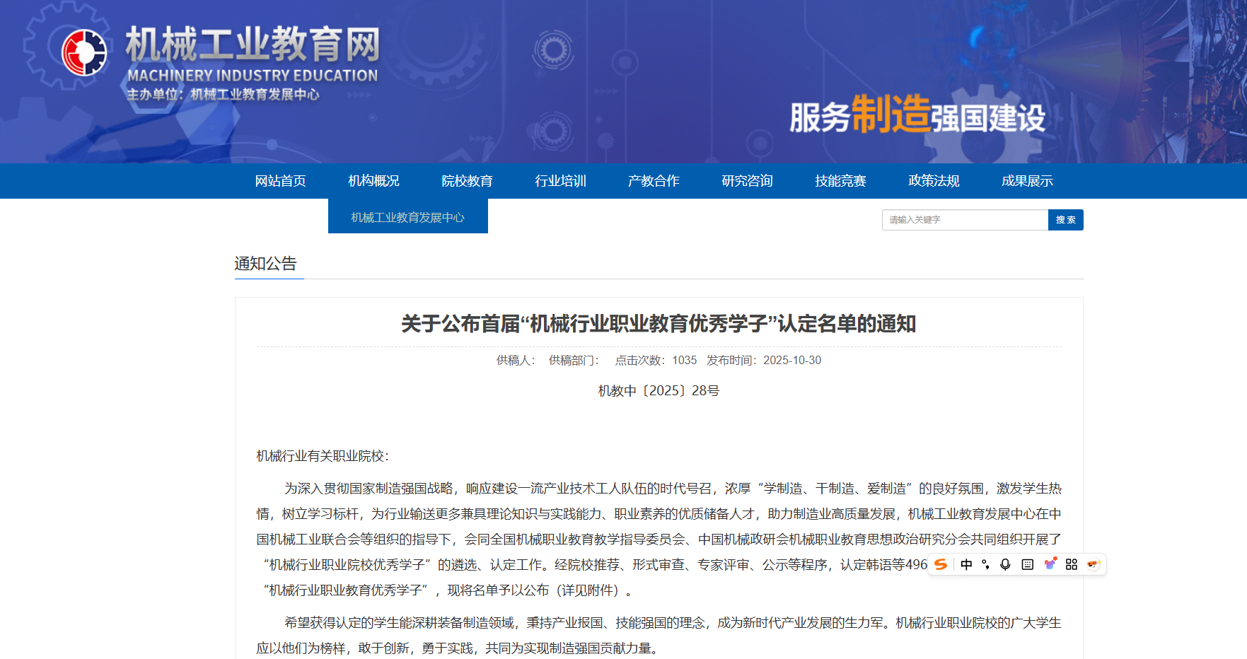 首届“机械行业职业教育优秀学子”评选由机械工业教育发展中心联合全国机械职业教育教学指导委员会等权威机构共同组织,旨在为制造强国战略选拔和储备高技能人才。本次评选面向全国机械行业职业院校2025届毕业生,经过严格的院校推荐、专家评审和公示程序,最终仅有496名学子获此殊荣。本届评选竞争激烈,机械工程学院10名学子同时入选,入选规模在全国院校中名列前茅,充分彰显了学院扎实的育人成效和卓越的人才培养质量。