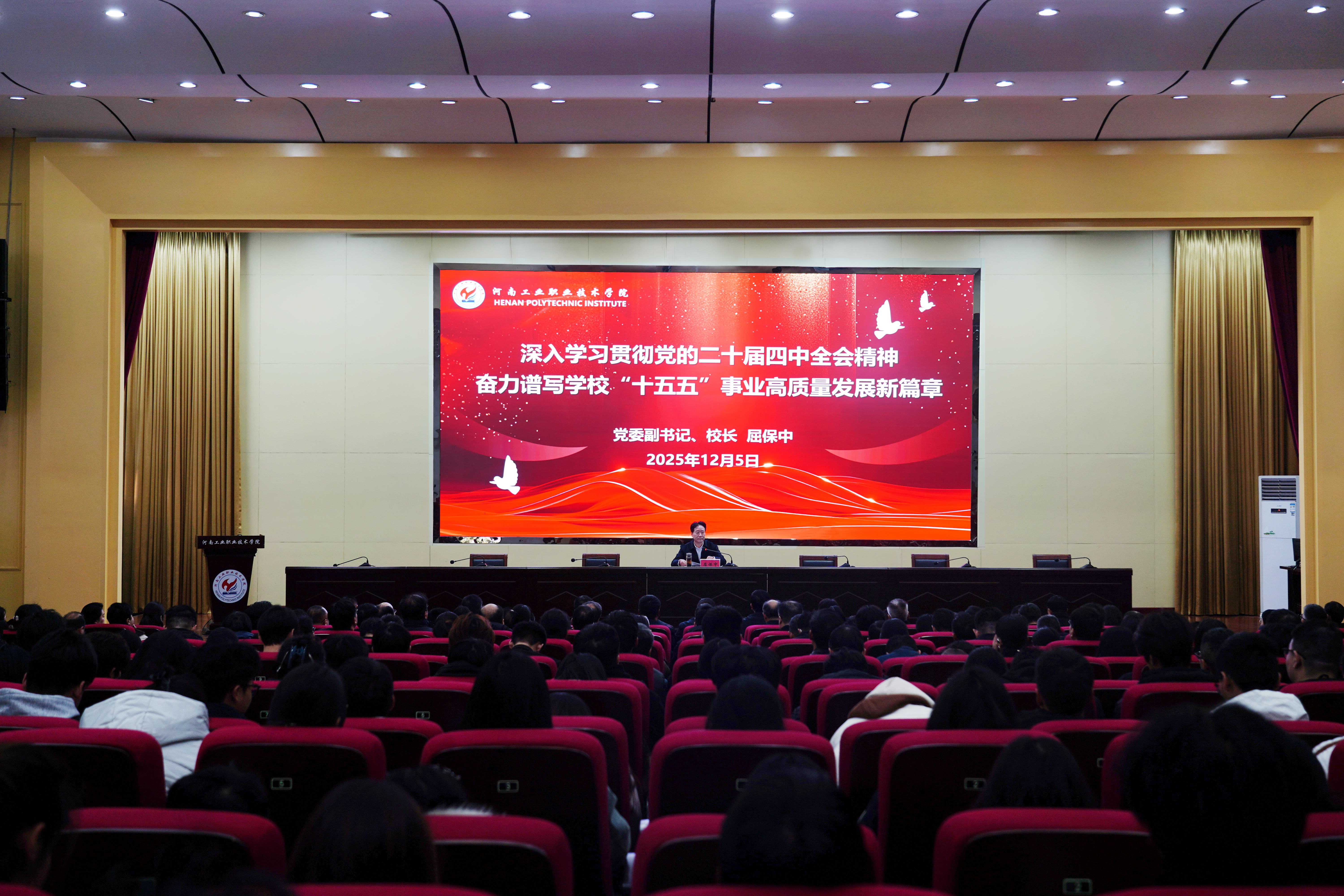 屈保中以《深入学习贯彻党的二十届四中全会精神 奋力谱写学校“十五五”事业高质量发展新篇章》为题,围绕“深刻领会全会召开的时代背景:在历史交汇点上把握前进方向”“准确把握核心要义与历史方位:在民族复兴伟业中找准职教使命”“精准对接战略部署与核心任务:推动全会精神在学校落地生根”“勠力同心勇担时代使命:以实干实绩谱写“十五五”发展崭新篇章”四个方面,全面阐述了党的二十届四中全会的时代背景、重大意义和核心要义,详细解读了“十五五”规划建议的重要内容,特别就教育和职业教育的战略定位、重点任务进行了深入解读。