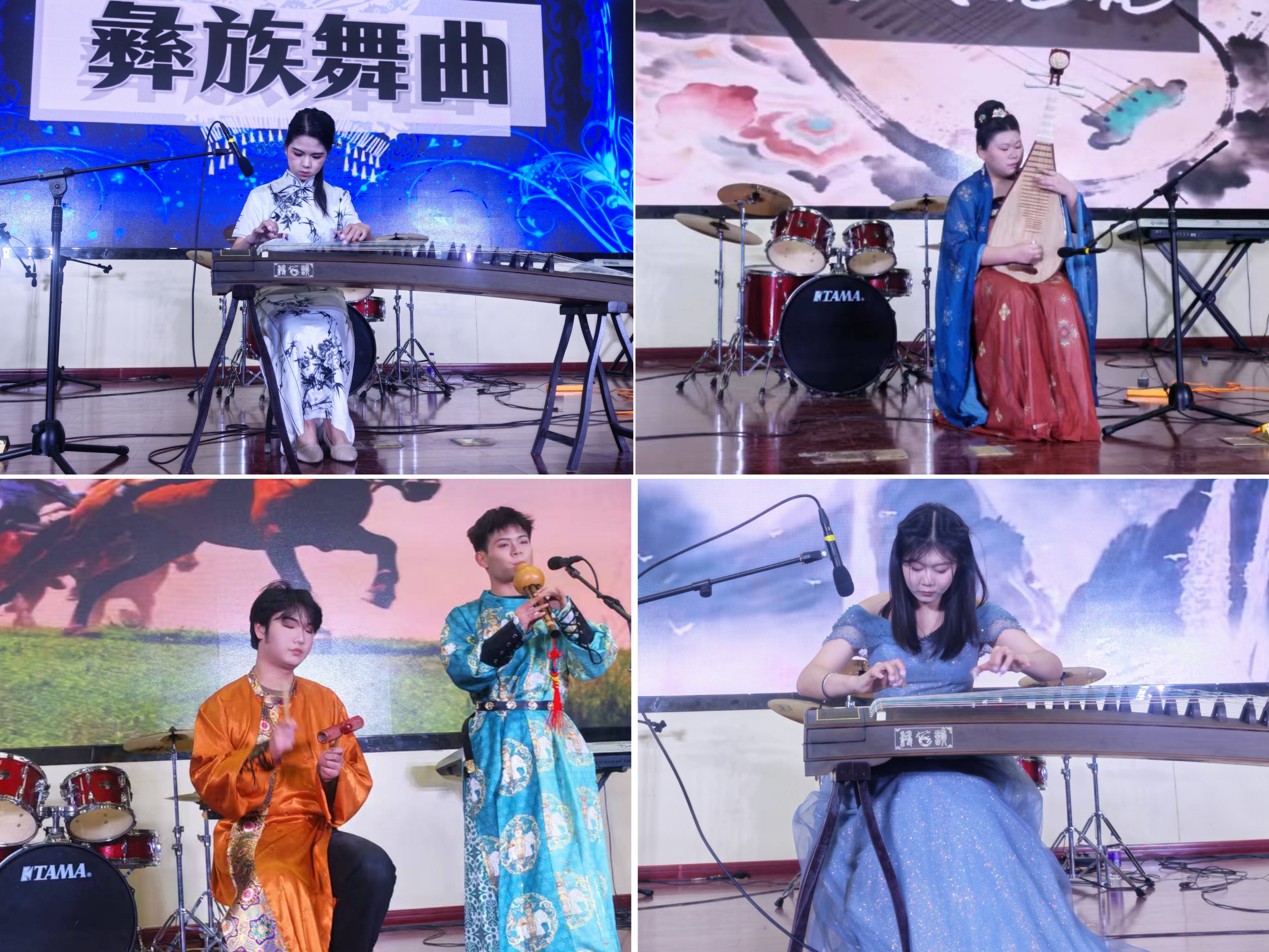 伴随着Demo乐队活力四射的开场曲《我的未来式》,大赛正式拉开帷幕。明快的节奏与热烈的旋律瞬间点燃现场气氛,为整场赛事奠定了青春昂扬的基调。比赛中,各参赛选手各显神通,不同乐器的独特魅力在指尖流转绽放,传统民乐演奏尤为引人注目。文化旅游与国际教育学院金晶晶的古筝独奏《彝族舞曲》,指尖在琴弦上轻盈跳跃,将彝族人民载歌载舞的欢乐场景描摹得惟妙惟肖,旋律时而悠扬婉转,时而欢快激昂,尽显古筝“民乐瑰宝”的韵味;自动化工程学院毋雨萱带来的古筝曲《战台风》则风格迥异,急促的轮指与有力的扫弦,生动再现了台风来袭时的磅礴气势与军民奋勇抗台的坚毅,赢得满堂喝彩。刘林玥的琵琶《送我一朵玫瑰花》节奏明快活泼,西域风情扑面而来;张政道的葫芦丝《赛马》则以精湛技巧模拟出万马奔腾的壮阔景象,让现场观众沉醉其中。