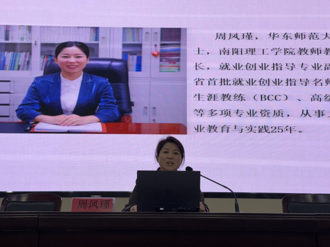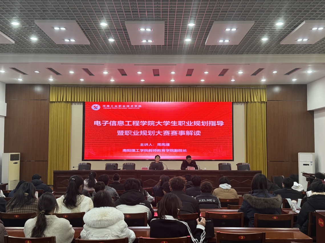 为帮助学生树立科学职业观,明确成长方向,深入了解大学生职业规划大赛的核心要点,11月24日,电子信息工程学院特邀南阳理工学院教师教育学院副院长、河南省首批就业创业指导名师周凤瑾副教授,对电子信息工程学院在校生开展 “大学生职业规划指导暨职业规划大赛赛事解读”专题讲座,电子信息工程学院党总支副书记杨旭主持讲座。