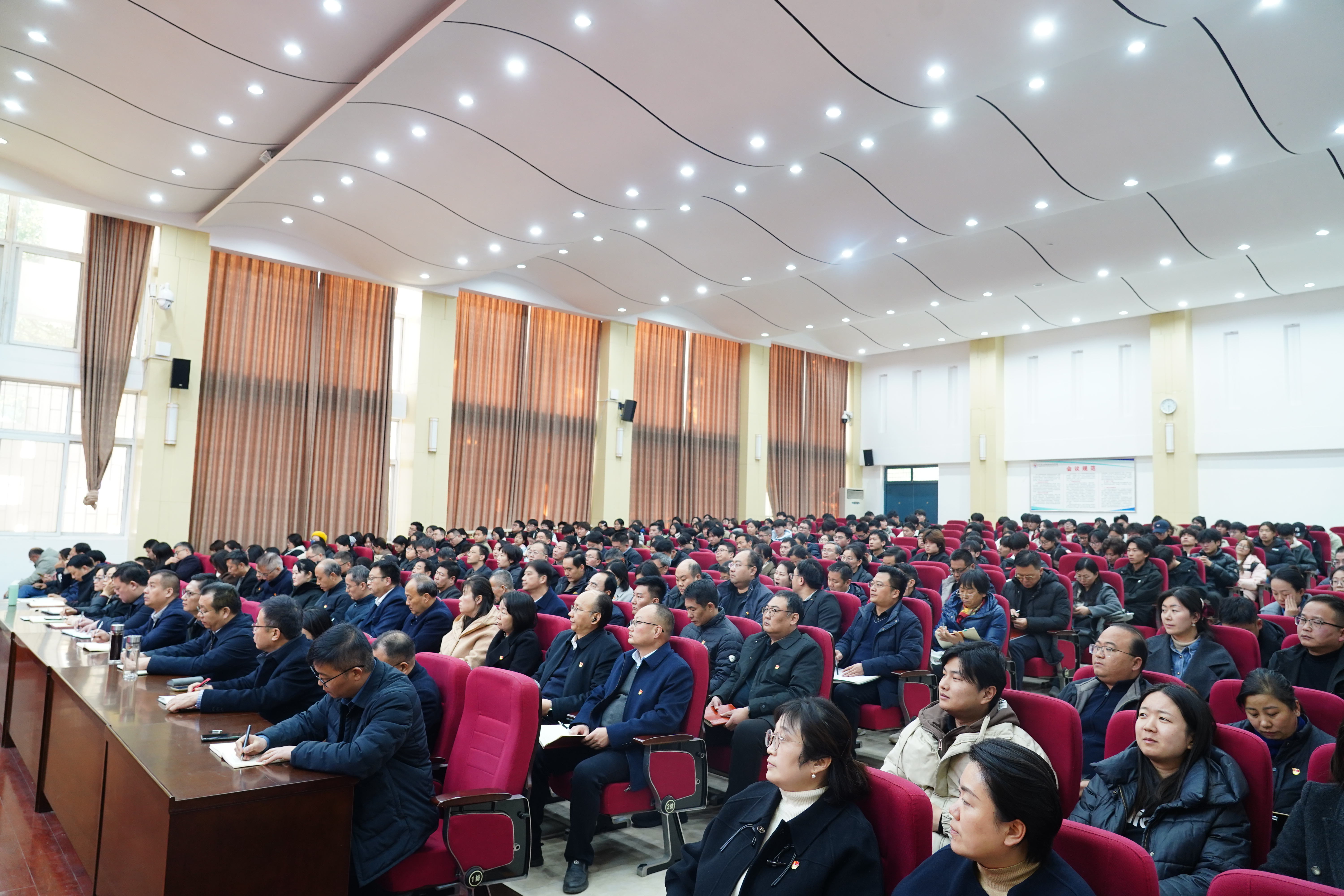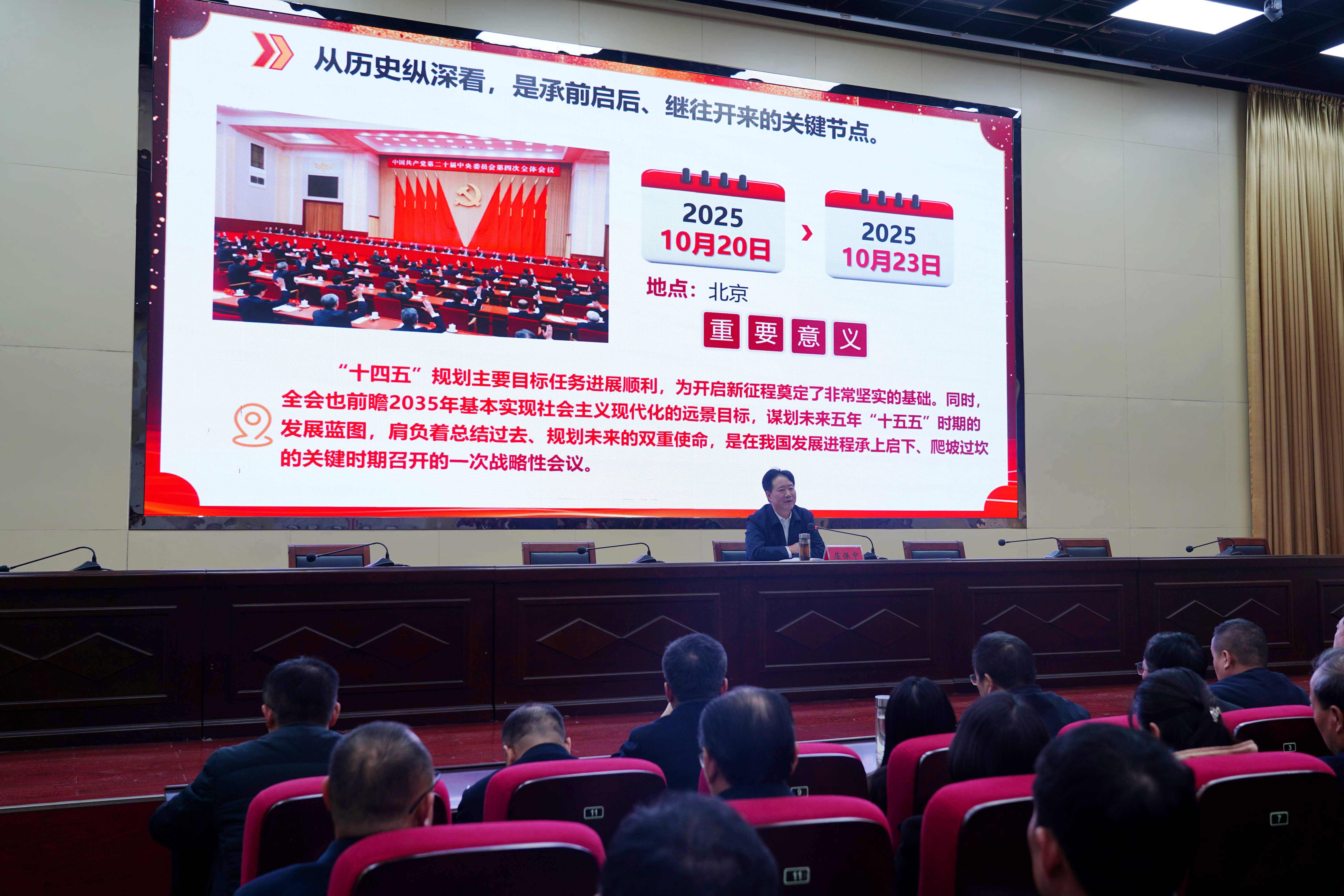 屈保中强调,这次全会是在“十四五”规划即将圆满收官、向2035年基本实现社会主义现代化稳步迈进、向第二个百年奋斗目标进军的关键时刻召开的一次十分重要的会议,全会审议通过的《中共中央关于制定国民经济和社会发展第十五个五年规划的建议》,科学擘画了未来五年国家发展的宏伟蓝图,是指导我们各项工作的行动纲领和根本遵循。学习宣传贯彻好党的二十届四中全会精神,是学校当前和今后一个时期的重大政治任务,全校上下要有序一体推进全方位宣传宣讲,通过组织领导干部讲党课讲思政课,组建校内宣讲团等多种方式扩大宣讲覆盖面,真正做到以讲促学、以学促干,推动全会精神入脑入心。
