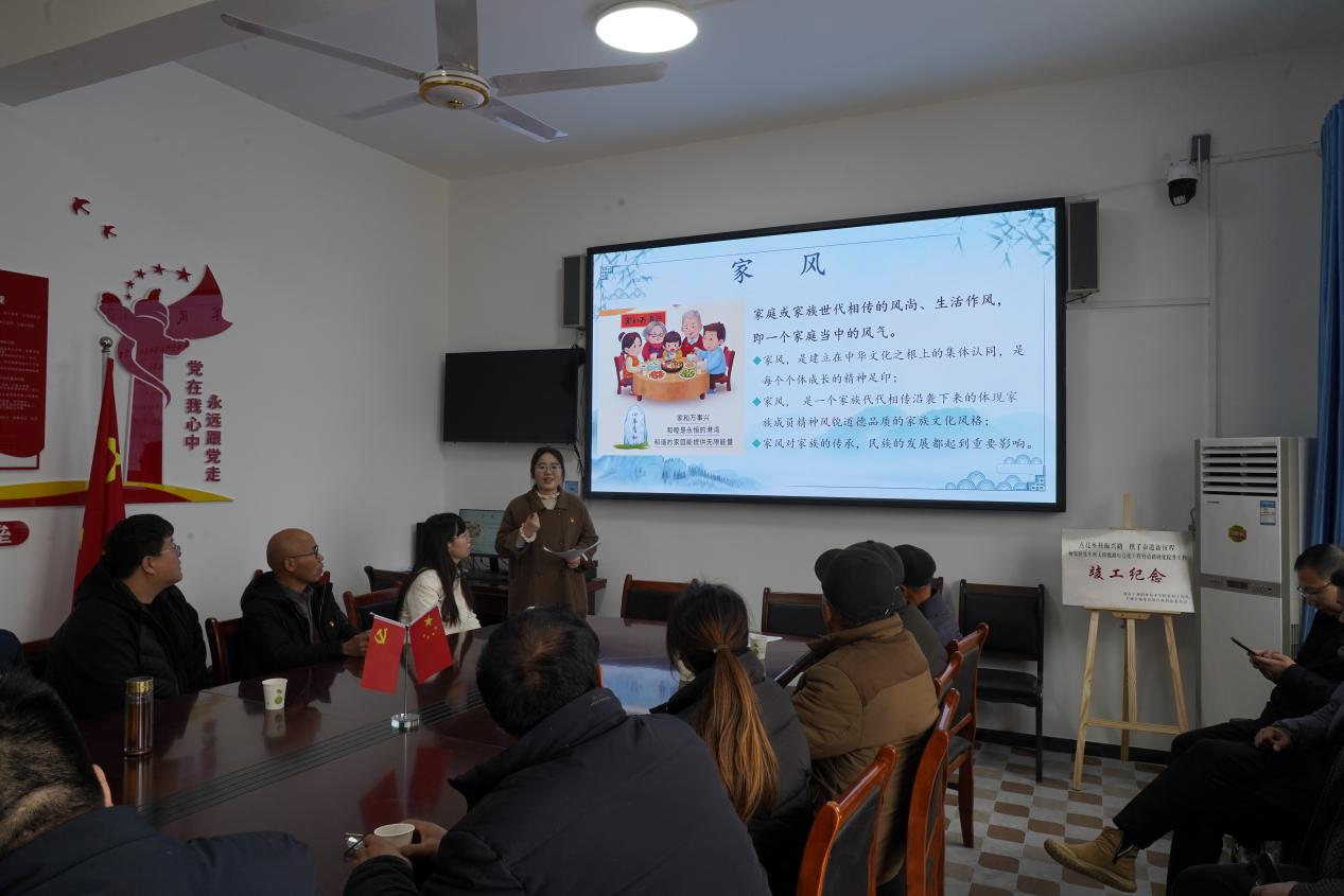 在优秀传统文化主题讲座环节,支部党员王艺琳、韩明睿同志以“立家法 传家训 树家风”为主题,带来了一场精彩生动的文化分享。讲座内容纵览古今,从范仲淹“先忧后乐”的家国情怀、包拯铁面无私的清廉诫训,到欧阳修母亲的“画荻教子”、朱熹的治家格言,以及王华教子的深沉智慧,深刻阐释了优良家风对个人修身、家庭和睦、社会和谐的重要影响。讲座还精心穿插了《三娘教子》《打金枝》等经典豫剧选段,以群众喜闻乐见的艺术形式,让传统美德更加入脑入心。
