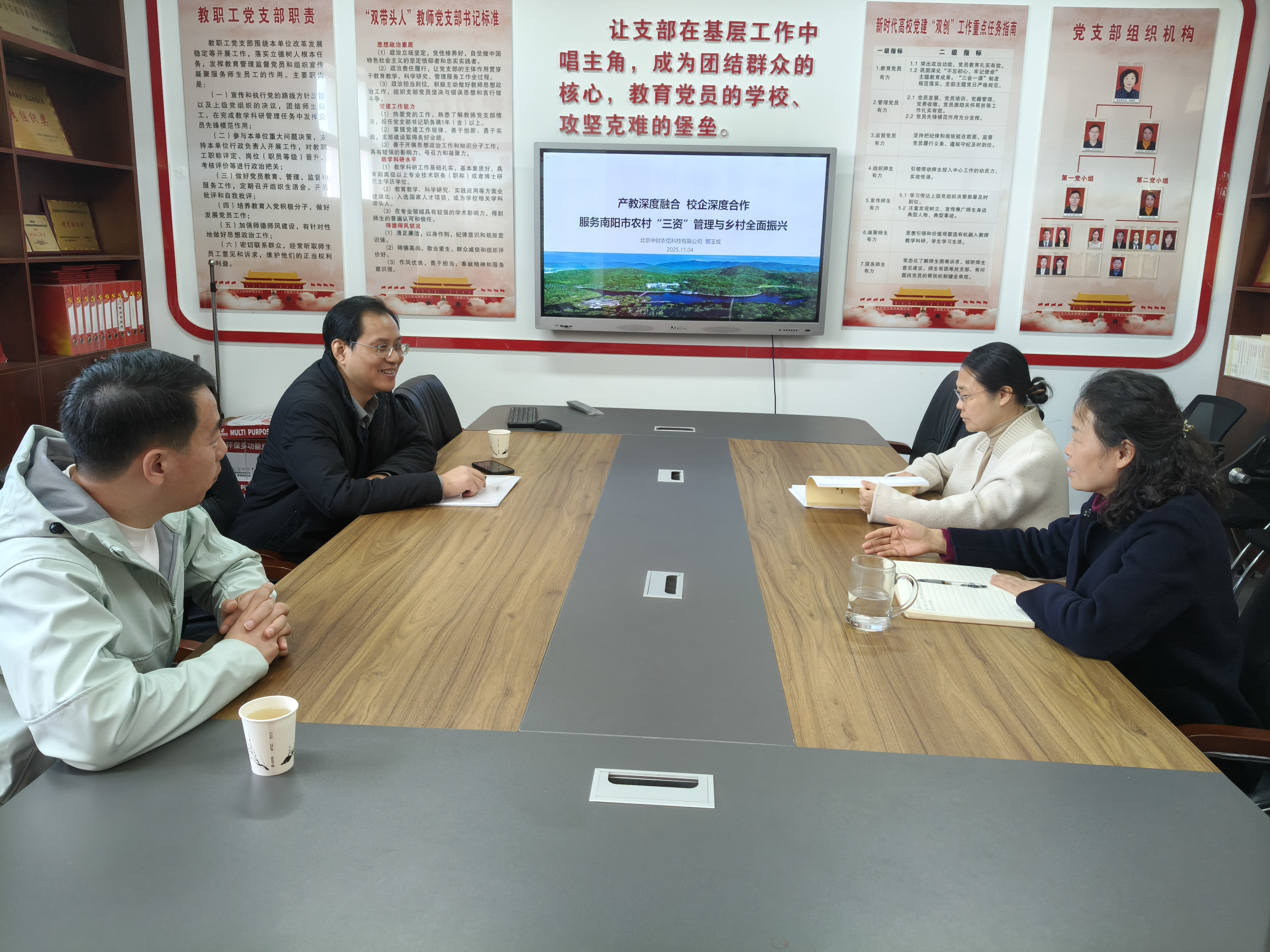 2025年11月4日,北京中财农信科技有限公司一行莅临我院,双方就学院专业群建设、服务国家乡村振兴战略等议题展开了深入且富有成效的交流。此次交流旨在挖掘学院发展潜力,推动学院专业群建设与南阳市区域经济的协同发展。