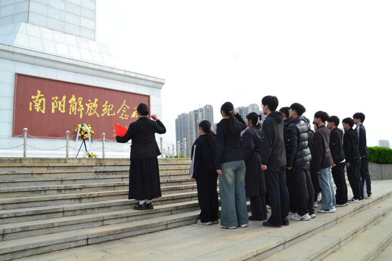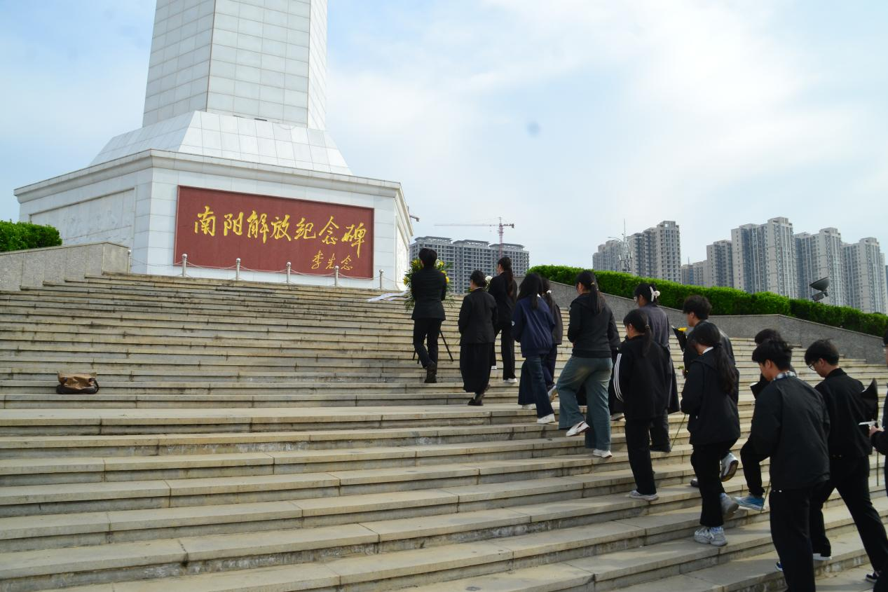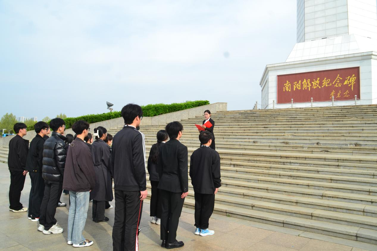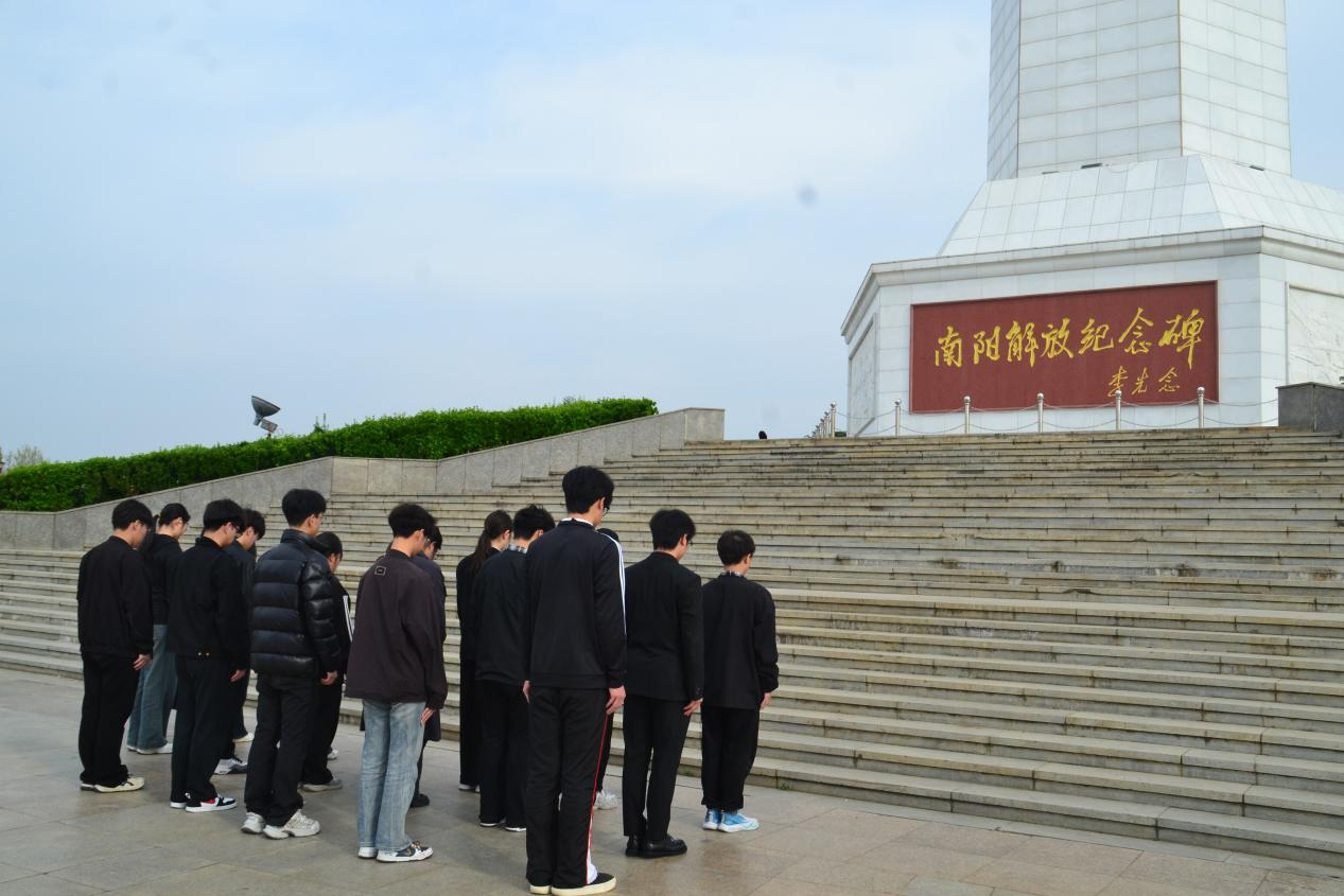 随后,全体师生面向纪念碑肃立默哀,向为南阳解放事业英勇献身的革命先烈表达深切哀思。现场气氛庄重,同学们神情肃穆,以无声的敬意告慰英烈忠魂。