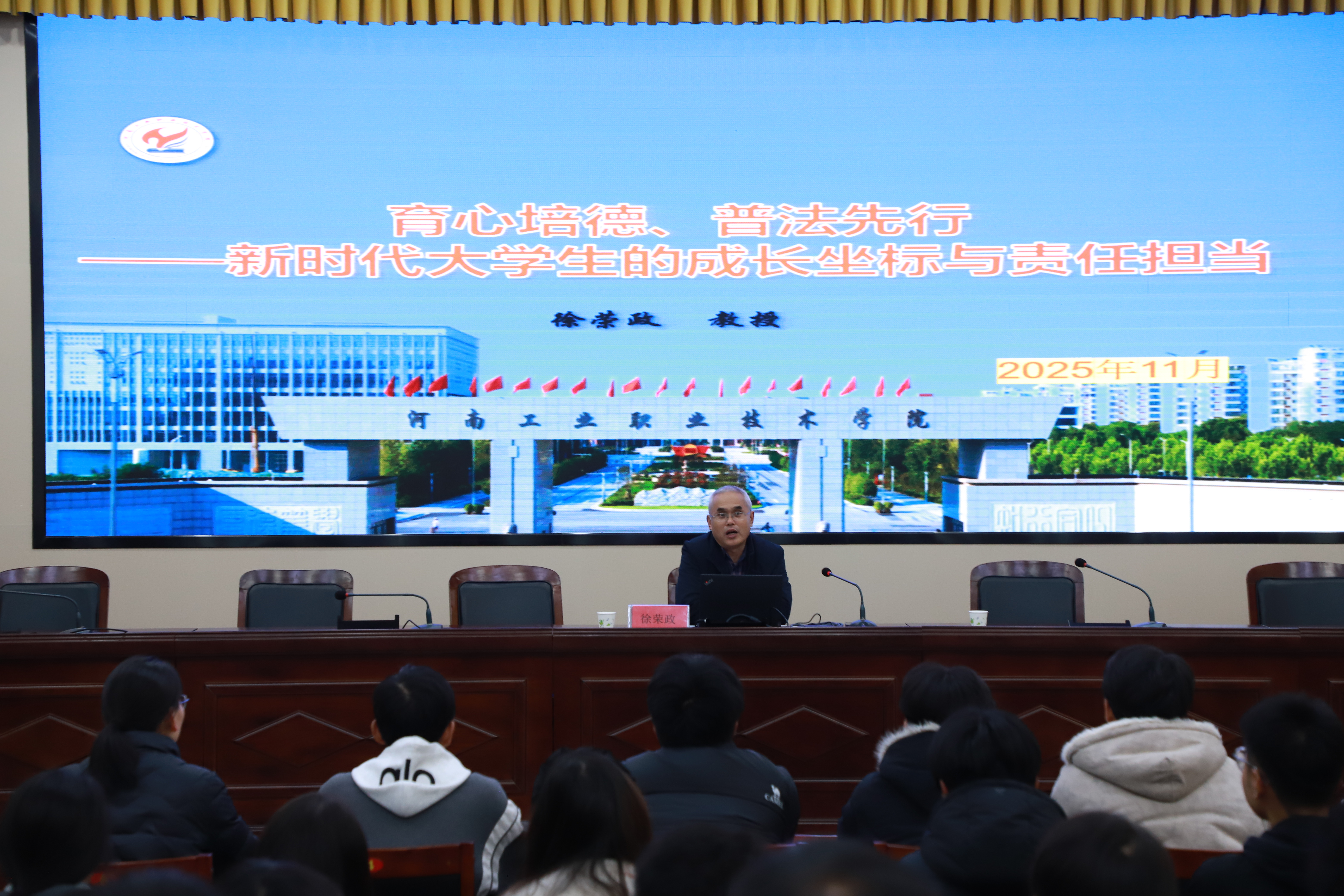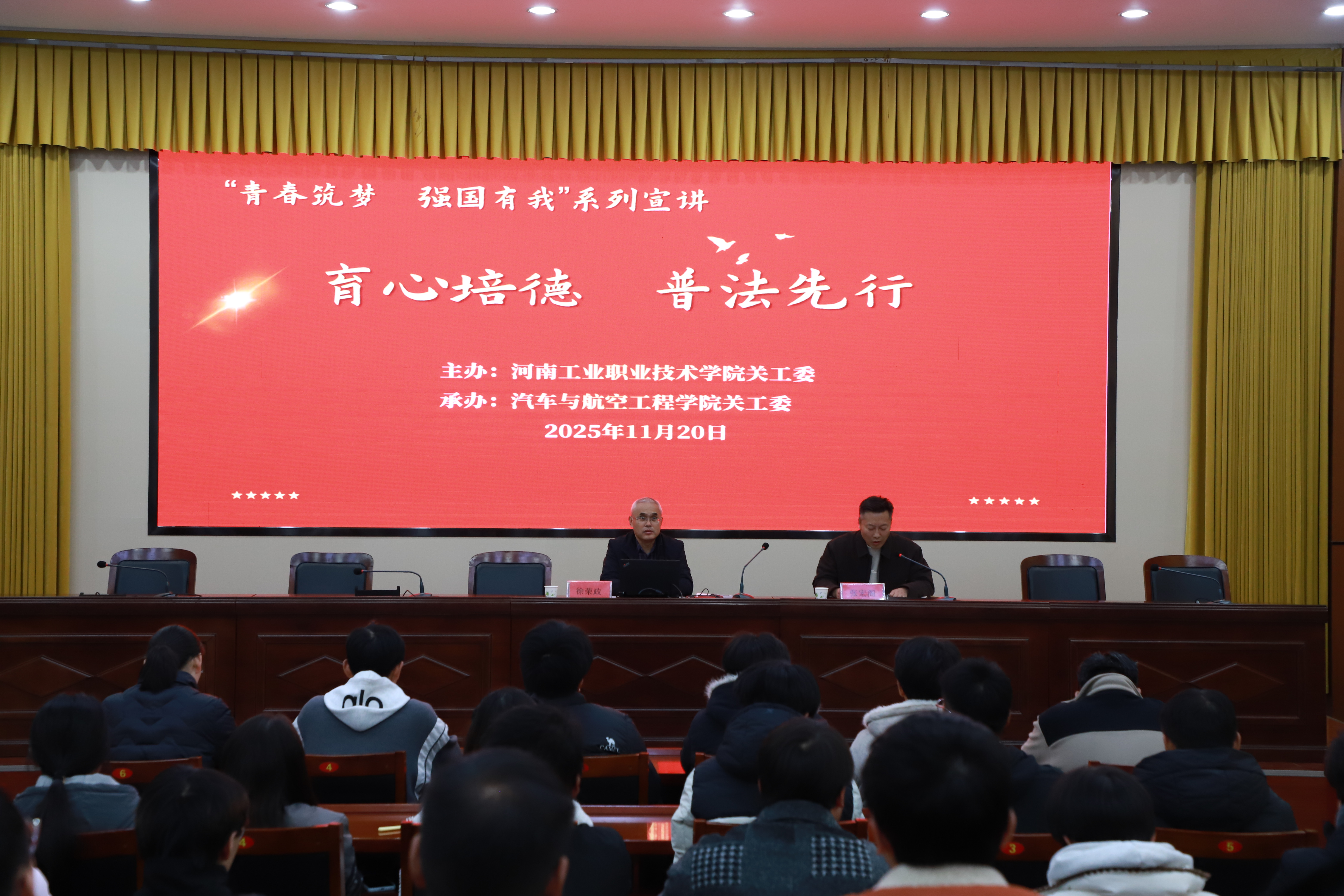 为切实加强青年学子思想道德建设,提升法治素养与心理调适能力,引导学生树立正确价值观念,汽车与航空工程学院关工委于11月20日在行政楼第一会议室举办“育心培德,普法先行”主题宣讲。本次讲座特邀学校关工委“青春筑梦 强国有我”德育宣讲团成员徐荣政教授担任主讲嘉宾,学院党总支书记张宏阁主持讲座,党总支副书记、全体辅导员及学生骨干、各班代表齐聚现场,共赴这场成长赋能之约。