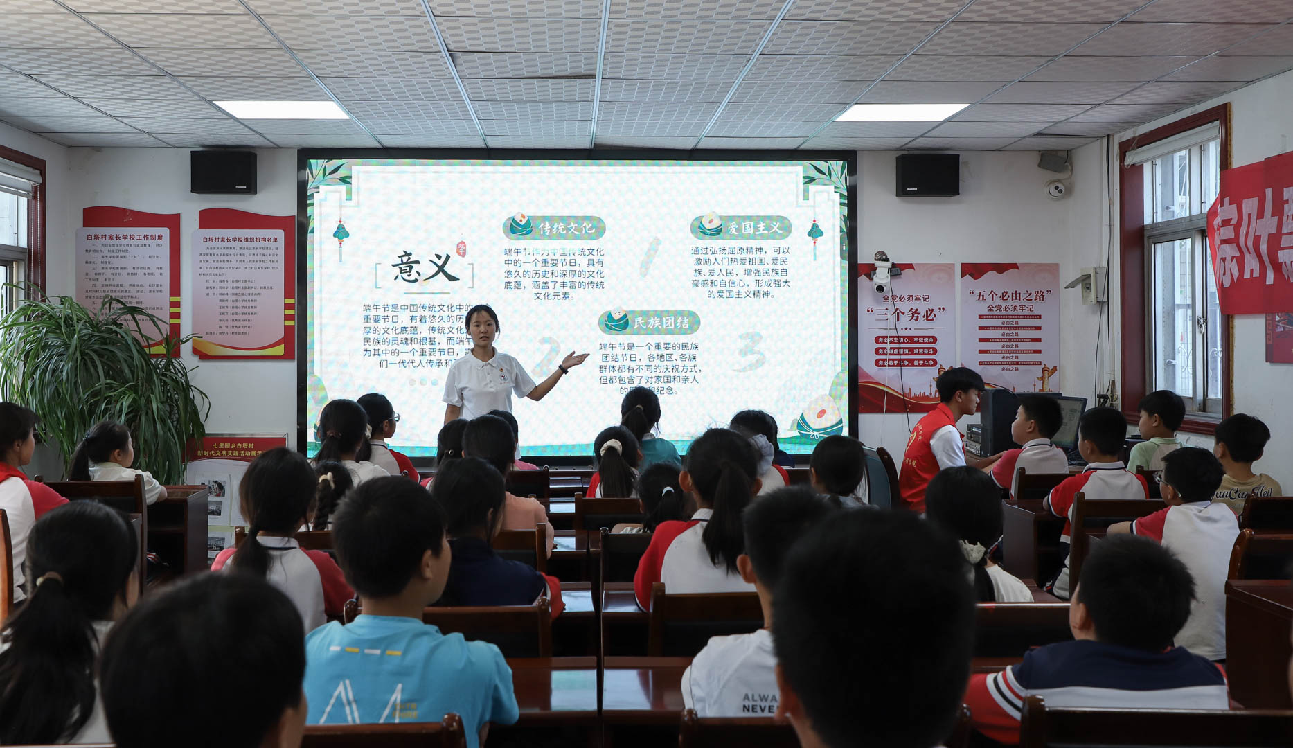 活动伊始,党员志愿者们通过生动有趣的PPT展示和绘声绘色的讲解,为孩子们讲述了端午节的起源、习俗。从屈原的爱国故事到赛龙舟、包粽子、挂艾草等传统习俗,孩子们听得津津有味,一双双好奇的眼睛里满是对传统文化的向往。在互动问答环节,孩子们踊跃举手,积极参与,现场气氛热烈,进一步加深了他们对端午节文化内涵的理解。