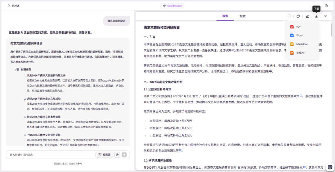 输入研究课题,它会自动拆解任务,并进行信息检索、整合、分析,最终生成一份可编辑、可下载、可视化的研究报告,还可以根据报告内容生成PPT,直接交付可用于汇报的成果。