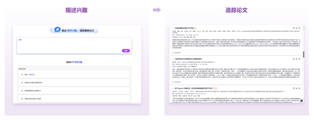 如何追踪?其实很简单,只需要直接描述研究兴趣,系统将通过智能语义分析,自动推荐高度相关的研究方向,添加“追踪”后,将对研究兴趣进行分解,构建知识脉络,并持续推送精准匹配的最新文献。