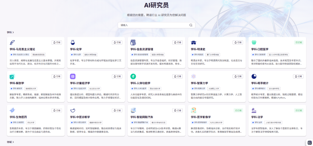 对标学科体系,构建跨领域的专业智能体集群。无论是需要学术理论的深度解析,还是专业操作的步骤指导,甚至是文化实践项目的方案设计,都可以从AI研究员这里获得精准支持。可以根据具体需求自由选择并选用不同的智能体,就像拥有了一支多学科、多领域的专家团队。