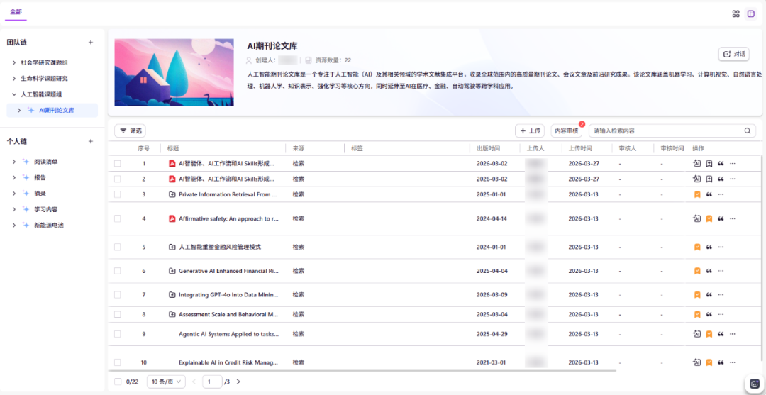 它能够整合团队资源、共享文献,构建团队专属的知识库,并进行深度交互;也支持个人阅读清单管理,构建个人学习体系,实现智能学习与知识管理。