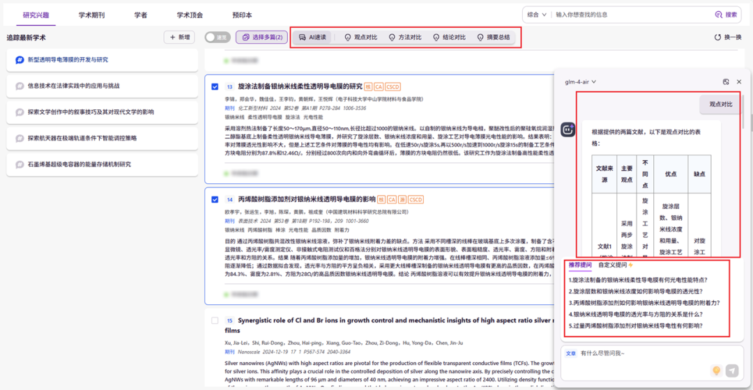 面对海量文献,如何快速锁定核心?如何吃透一篇顶刊?AI文献深度对话功能将彻底改变你的阅读体验。它支持用户与期刊、学者进行“对话”式交互,能够快速解析单篇文献,也能对多篇文献进行矩阵比对,让以往耗时费力的“啃文章”过程变得轻松而高效。
