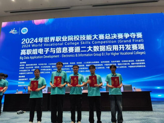10月26日至29日,2024年世界职业院校技能大赛总决赛争夺赛“大数据应用开发”赛项在海南软件职业技术学院举行,赛项共吸引来自全国各省、自治区、直辖市的61支职业院校代表队同台竞技。由我校电子信息工程学院肖承宁、王楚鑫、黄耀锋、姬钰婷四位同学组成的代表队,在毛峥、刘洪坡两位老师的精心指导下,凭借过硬素质、娴熟技能和卓越的团队协作能力喜获大赛金奖。