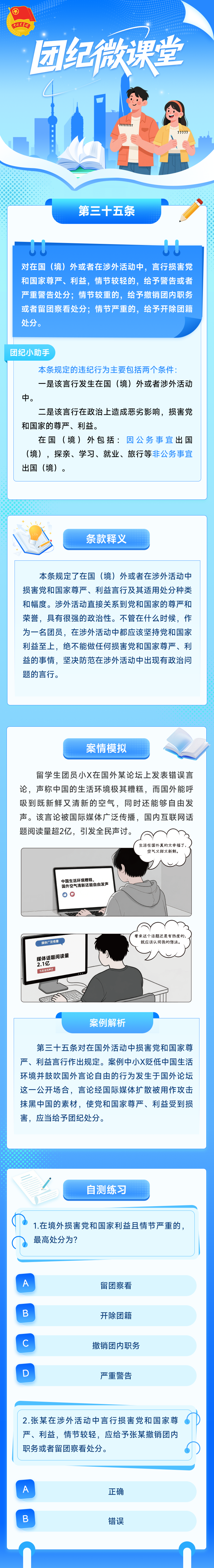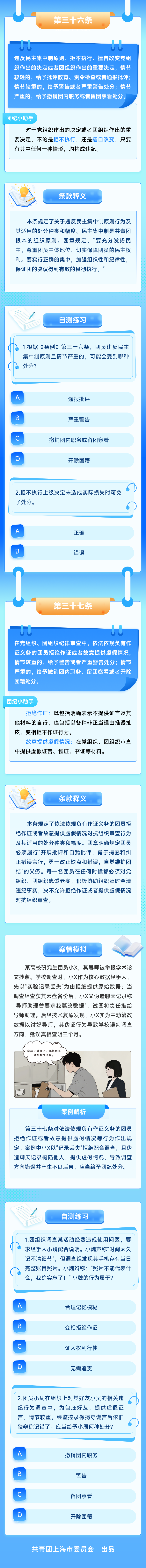 为帮助广大团员深入理解新修订的《中国共产主义青年团纪律处分条例(试行)》(以下简称《条例》),做到学纪、知纪、明纪、守纪,团上海市委组织编写了《团纪微课堂》学习手册,详细介绍《条例》第四章“对违反纪律行为的处分”,帮助团员更好理解各类违反纪律的具体行为及其适用的处分种类和幅度。手册以长图连载形式推送,第三期推出《条例》第三十五、三十六、三十七条学习内容。