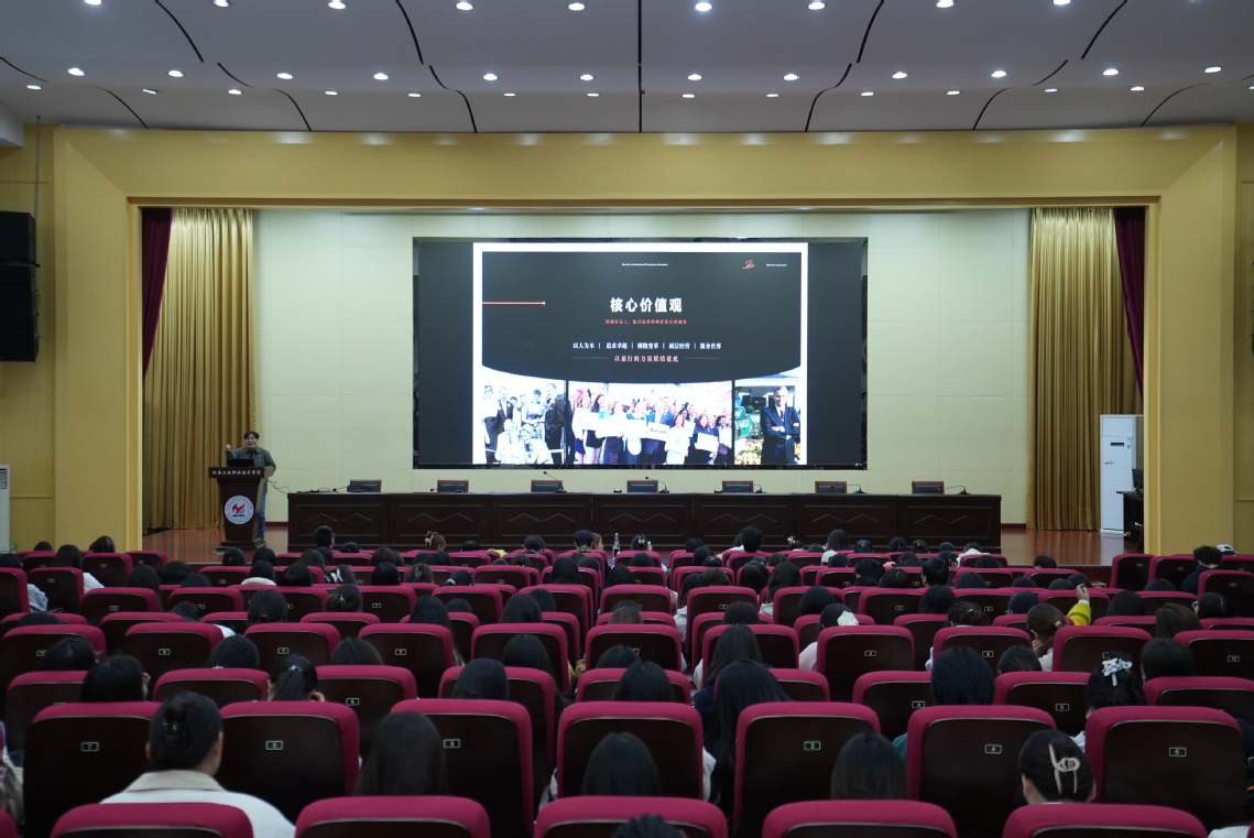 开班仪式上,王阳从多维度展开分享。她先以时间线梳理万豪酒店发展史,让学生直观感受行业龙头企业发展史与深厚底蕴。随后对品牌“以人为本”价值观进行解读,结合河南区域酒店实践,展现其对服务品质与员工关怀的重视。针对学生关切的职业发展问题,王阳详解万豪“多元化职业路径”,从基层实习到管理岗晋升,再到“导师计划”“轮岗培养”等人才项目,清晰勾勒成长方向,并结合案例说明岗位分配、培训支持等管理体系,消除学生实习顾虑。