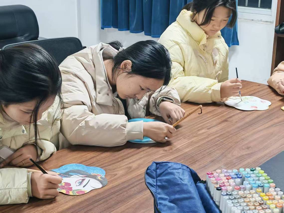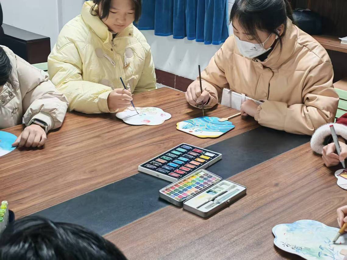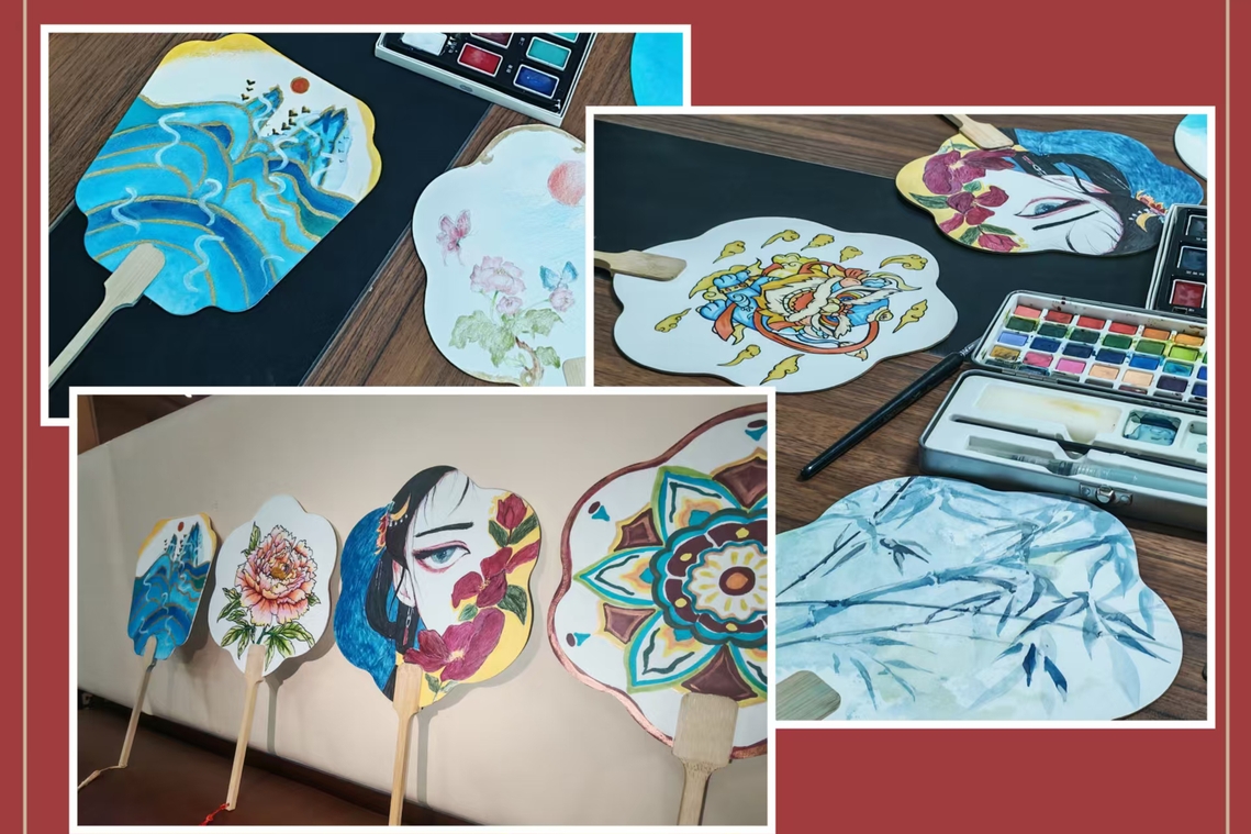 听完讲解后,同学们兴致勃勃地投入创作。大家手握画笔,或凝神构思,或提笔勾勒,或蘸色晕染。花鸟鱼虫、山水景致、吉祥纹样……一幅幅充满巧思的图案在素白的扇面上逐渐显现。有的同学偏爱清新雅致的水墨风格,有的同学钟情色彩明艳的工笔花鸟,还有的同学将现代审美与传统元素巧妙融合,赋予团扇新的生机与活力。创作过程中,同学们相互交流心得、切磋技艺,现场洋溢着欢乐祥和的节日氛围。