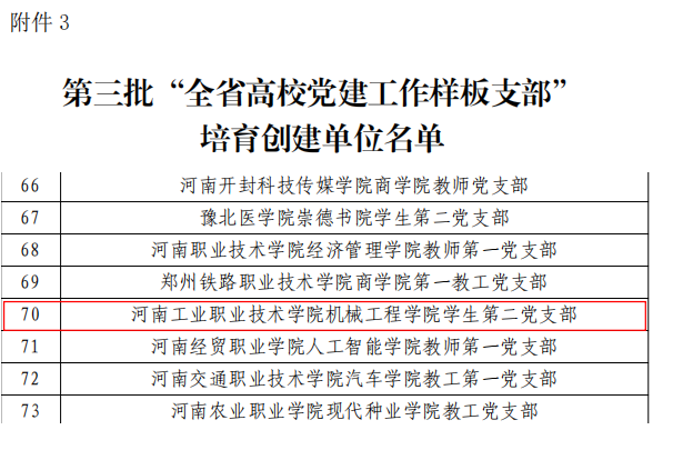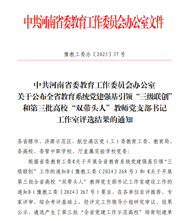 近日,中共河南省委教育工作委员会办公室下发《关于公布全省教育系统党建强基引领“三级联创”和第三批高校“双带头人”教师党支部书记工作室评选结果的通知》(豫教工委办〔2025〕37 号),我校自动化工程学院党总支入选“全省高校党建工作标杆院系”培育创建单位、机械工程学院学生第二党支部入选“全省高校党建工作样板支部”培育创建单位。