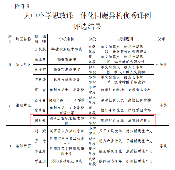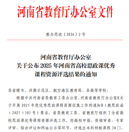 近日,河南省教育厅发布《关于公布2025年河南省高校思政课优秀课程资源评选结果的通知》(教办思政〔2026〕2号),学校马克思主义学院教师表现突出,在9个评审类别中获奖11项。其中,“毛泽东思想和中国特色社会主义理论体系概论”和“形势与政策”两门课程荣获全省样板课程荣誉称号;吴楠、张琨两位老师荣获示范“金课”二等奖;刘真、梁丹两位老师分别荣获中华优秀传统文化融入高校思政课优秀案例特等奖和一等奖;魏爽老师荣获“新时代伟大变革”融入高校思政课优秀案例一等奖;魏爽、张晓梅、王美华老师团队分别荣获优秀实践教学资源特等奖、一等奖和二等奖;魏丹丹老师荣获大中小学思政课一体化同题异构优秀课例一等奖。