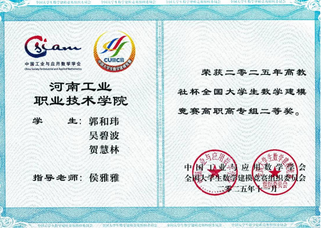 近日,2025年“高教社杯”全国大学生数学建模竞赛成绩正式揭晓。我校参赛学子以扎实的专业功底和卓越的实践创新能力,斩获国家级二等奖2项、省级一等奖5项、省级二等奖5项、省级三等奖6项的优异成绩,彰显了我校高素质技术技能人才培养的显著成效。