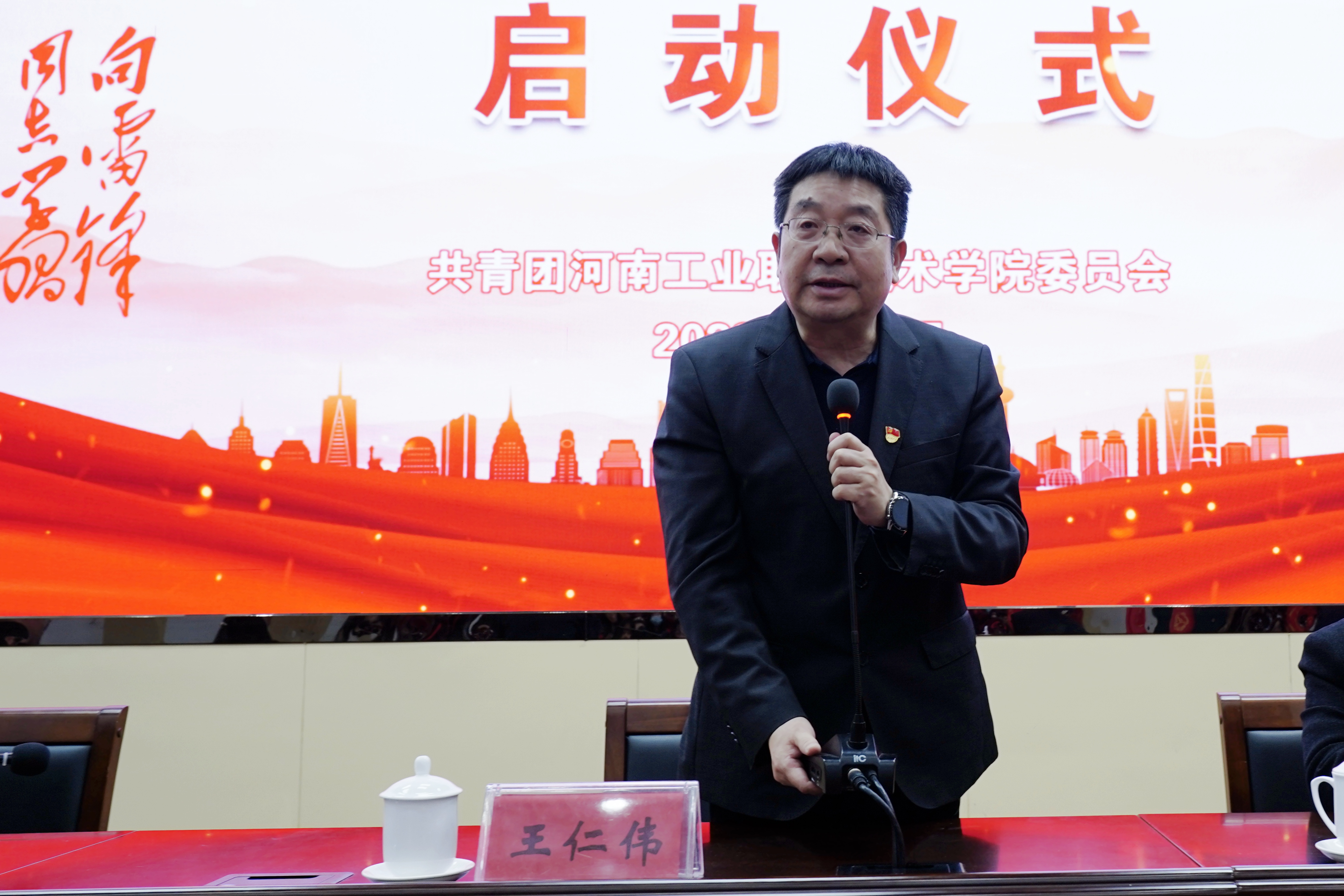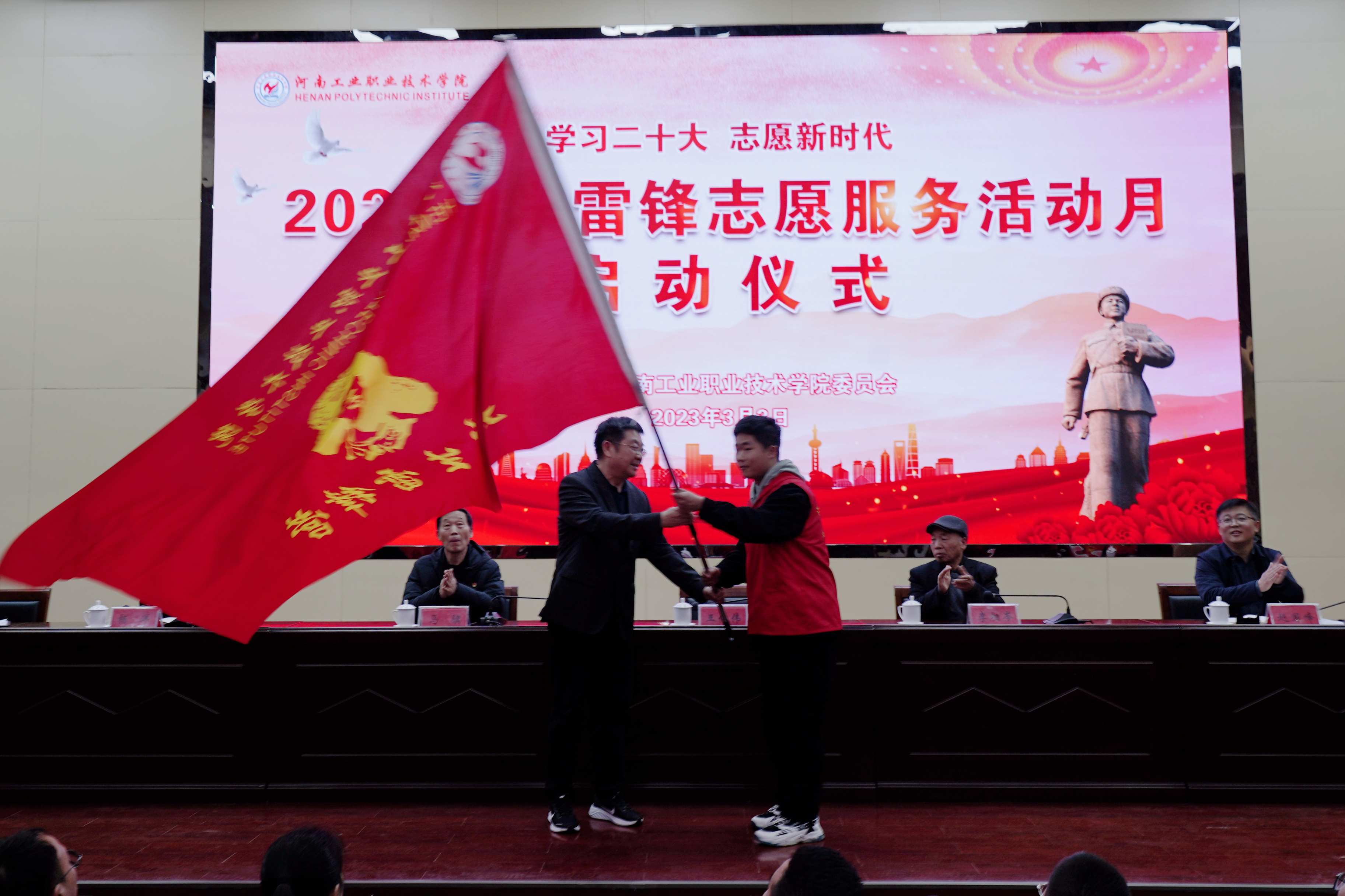 王仁伟分别向学校大学生雷锋营、各学院(中心)雷锋连授旗,并宣布河南工业职业技术学院2023年学雷锋志愿服务活动月正式启动。