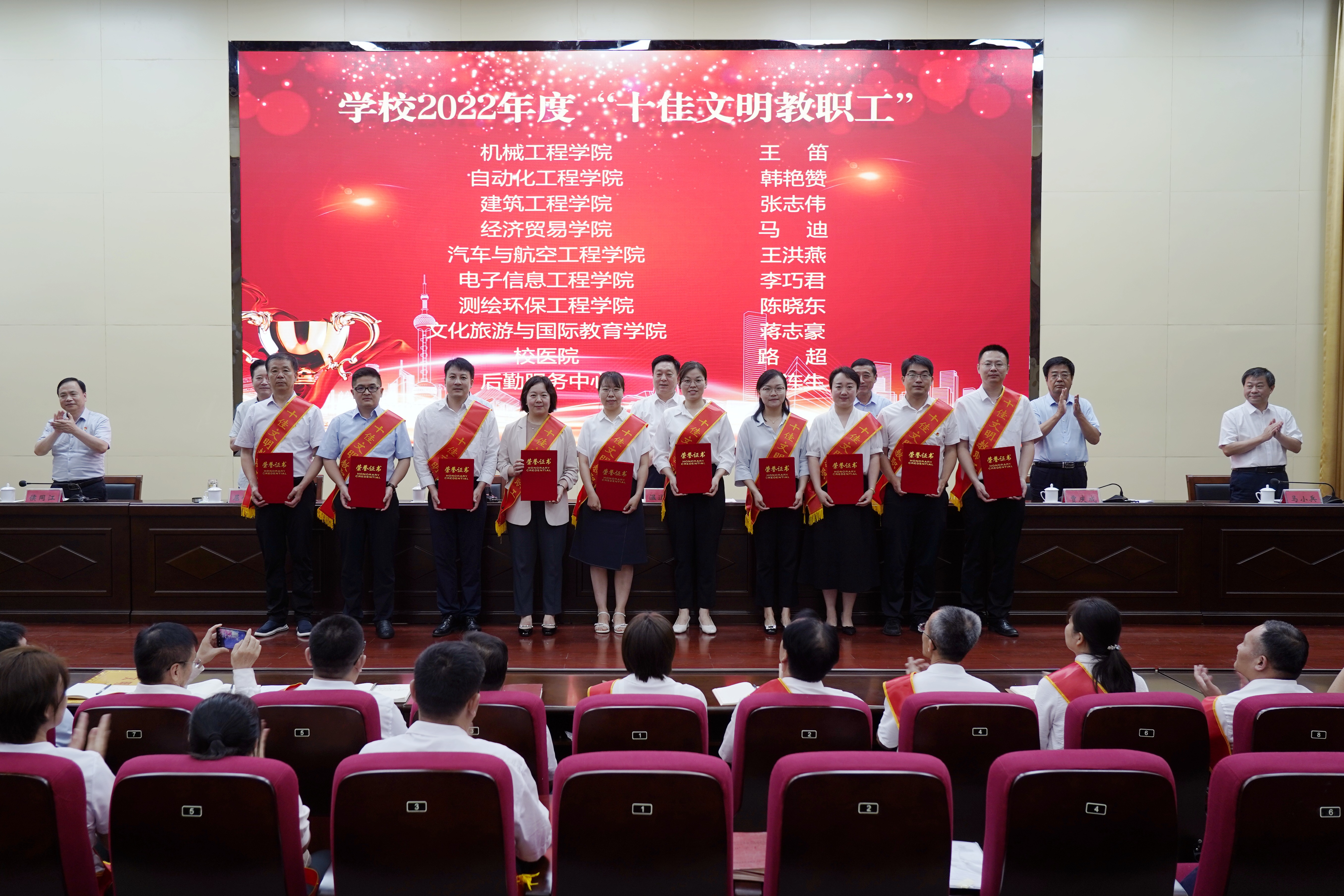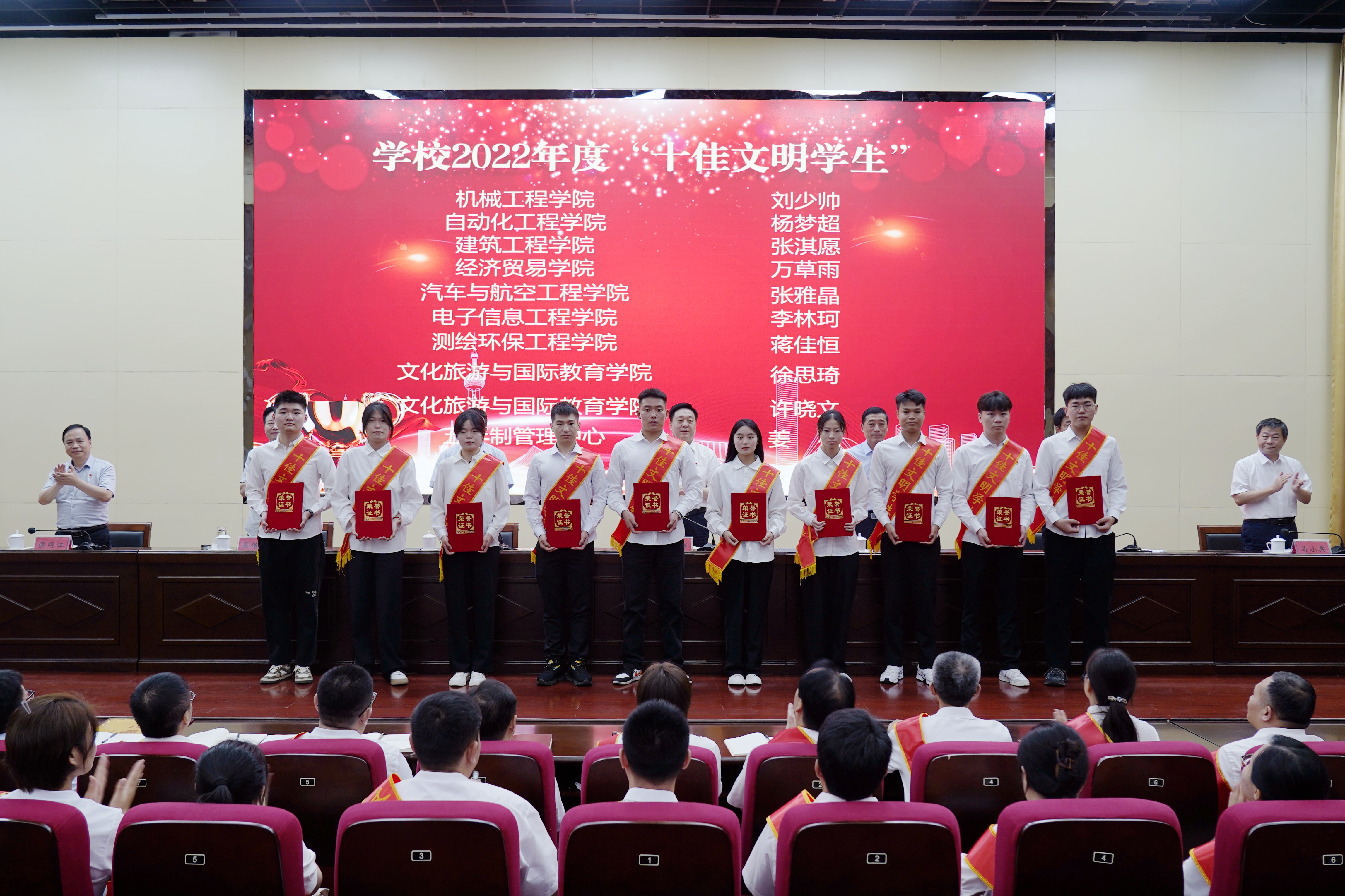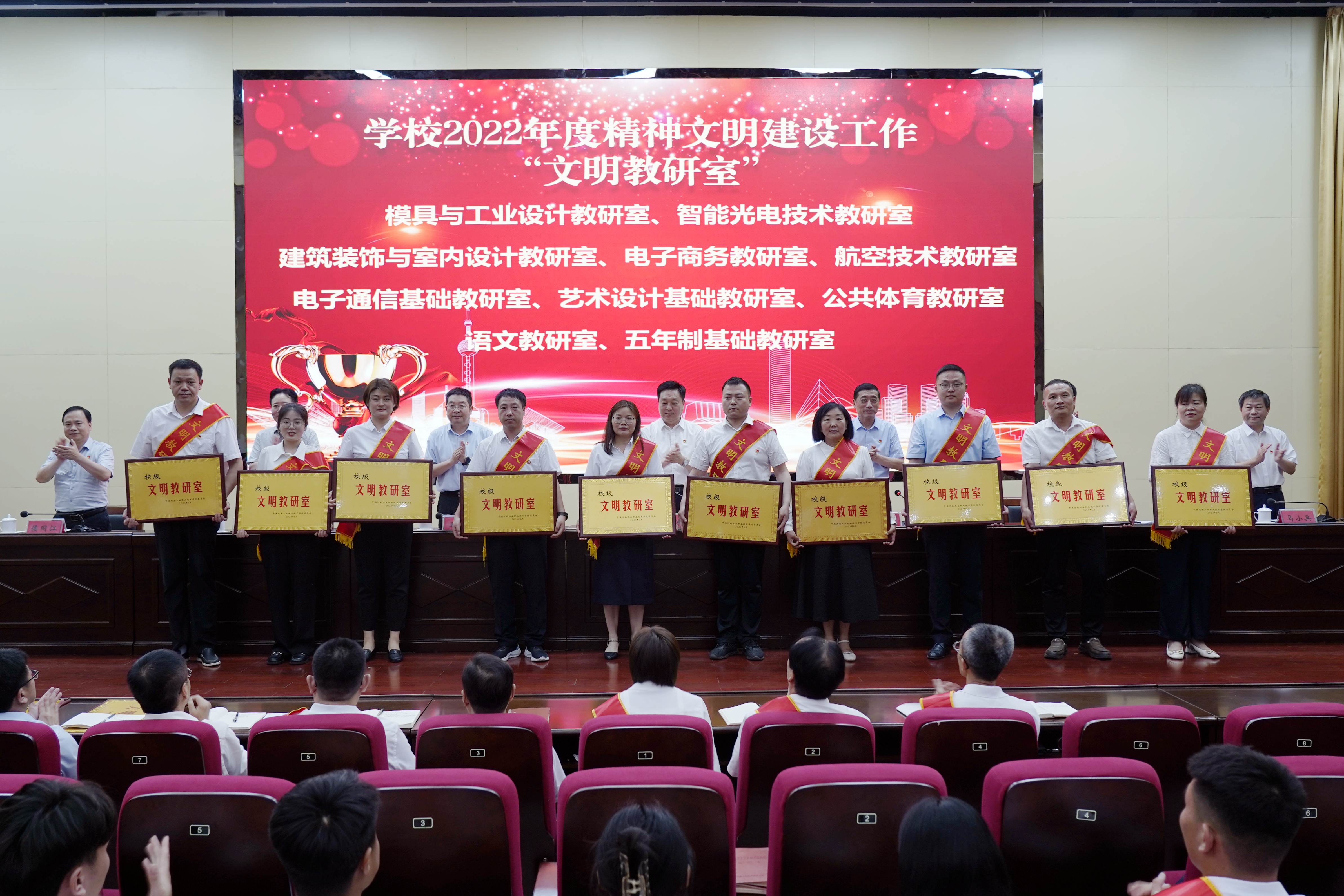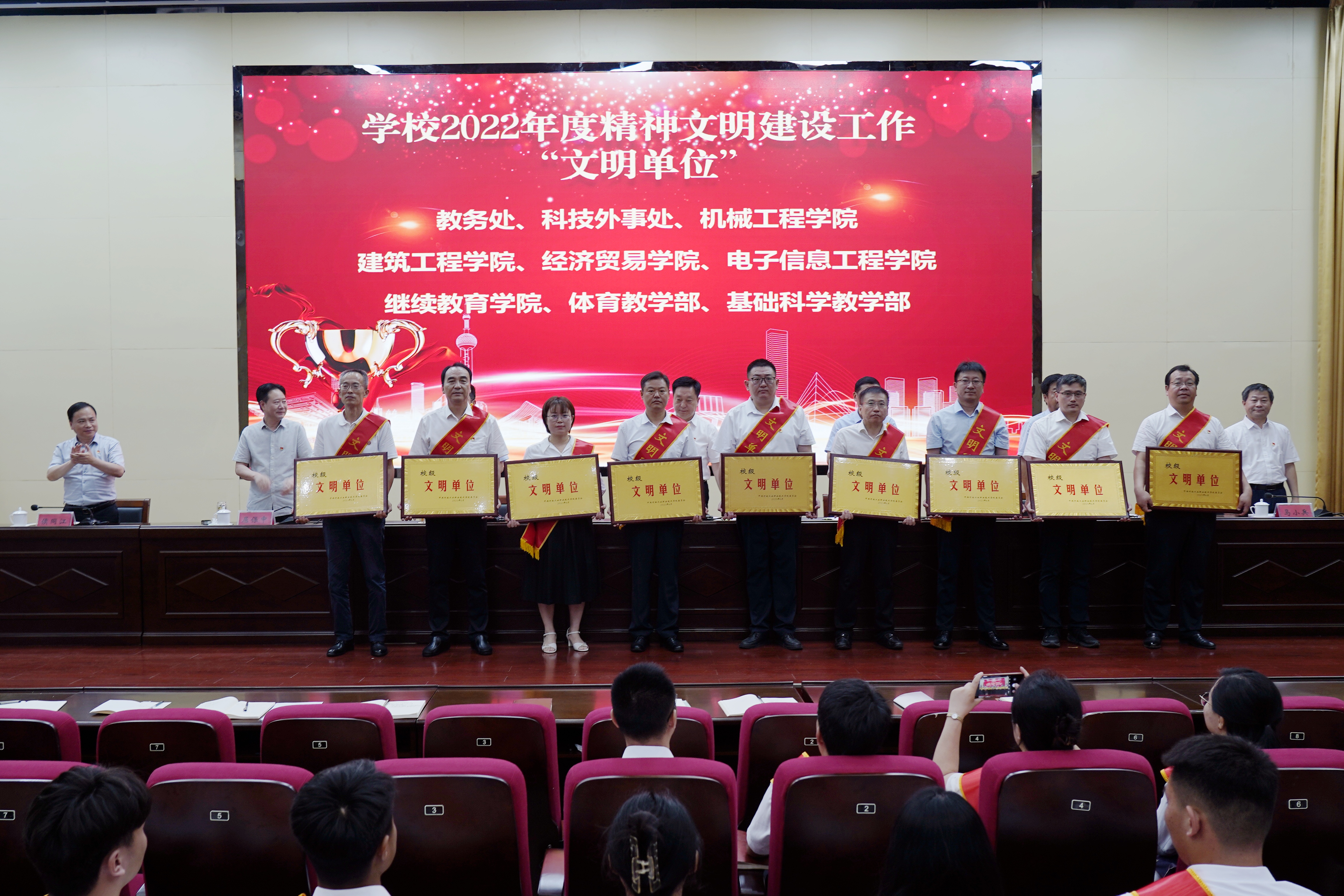 会上,副校长贾庆成宣读了学校《关于表彰2022年度精神文明建设工作文明集体、文明个人的决定》《关于表彰2022年度“十佳文明教职工”“十佳文明学生”的决定》。出席会议的校领导向荣获“文明单位”“文明教研室”代表、“十佳文明教职工”“十佳文明学生”颁发了奖牌和证书。