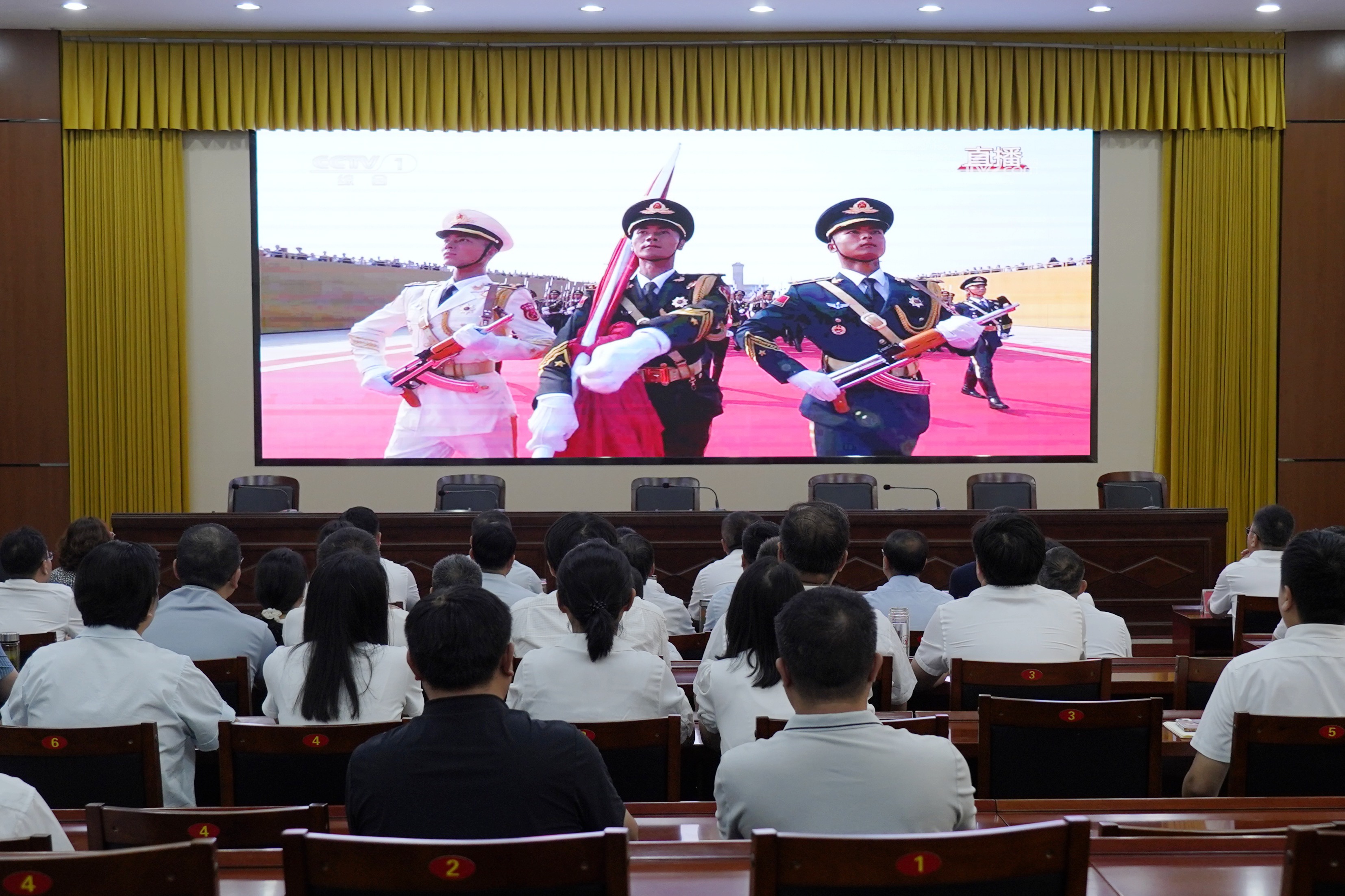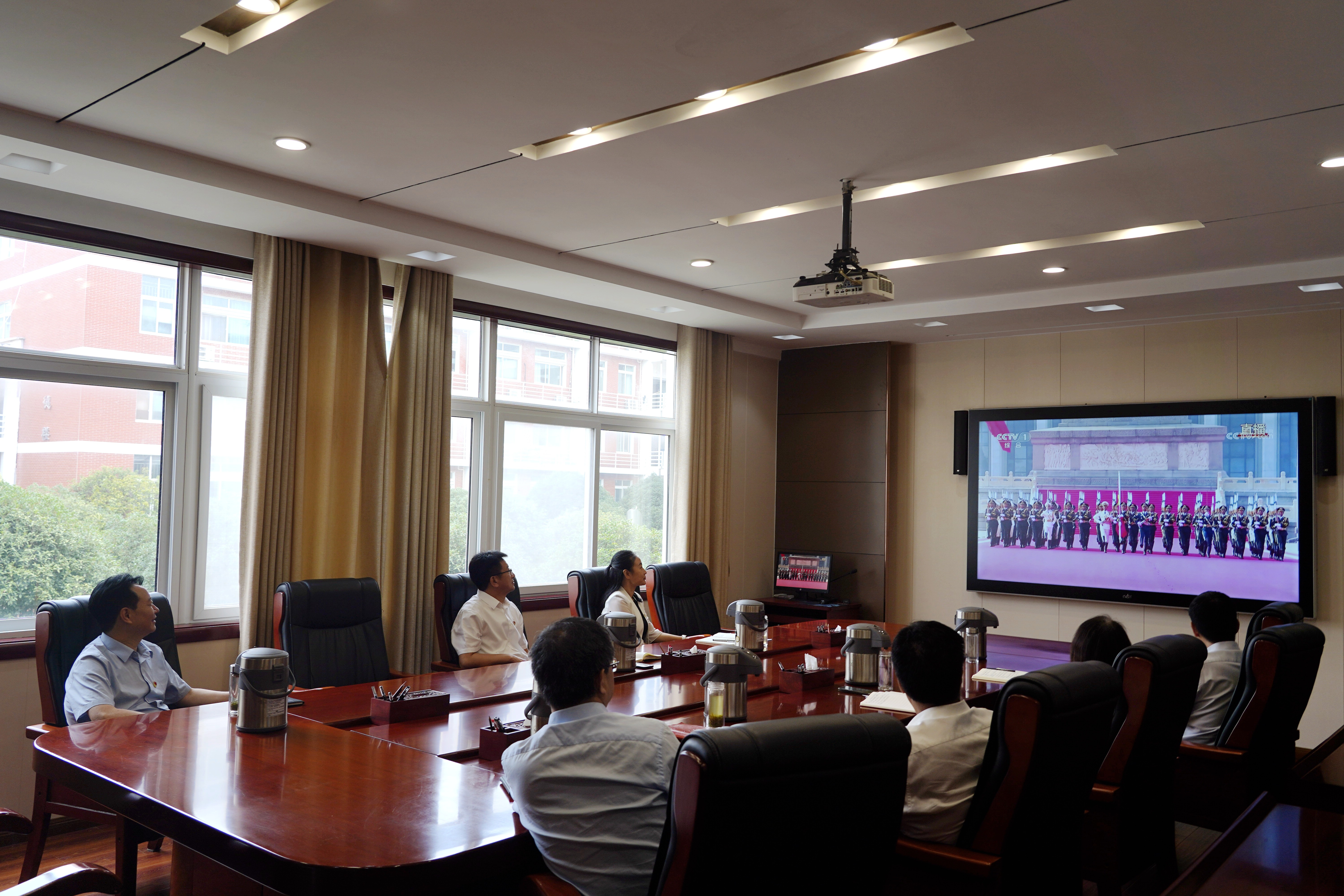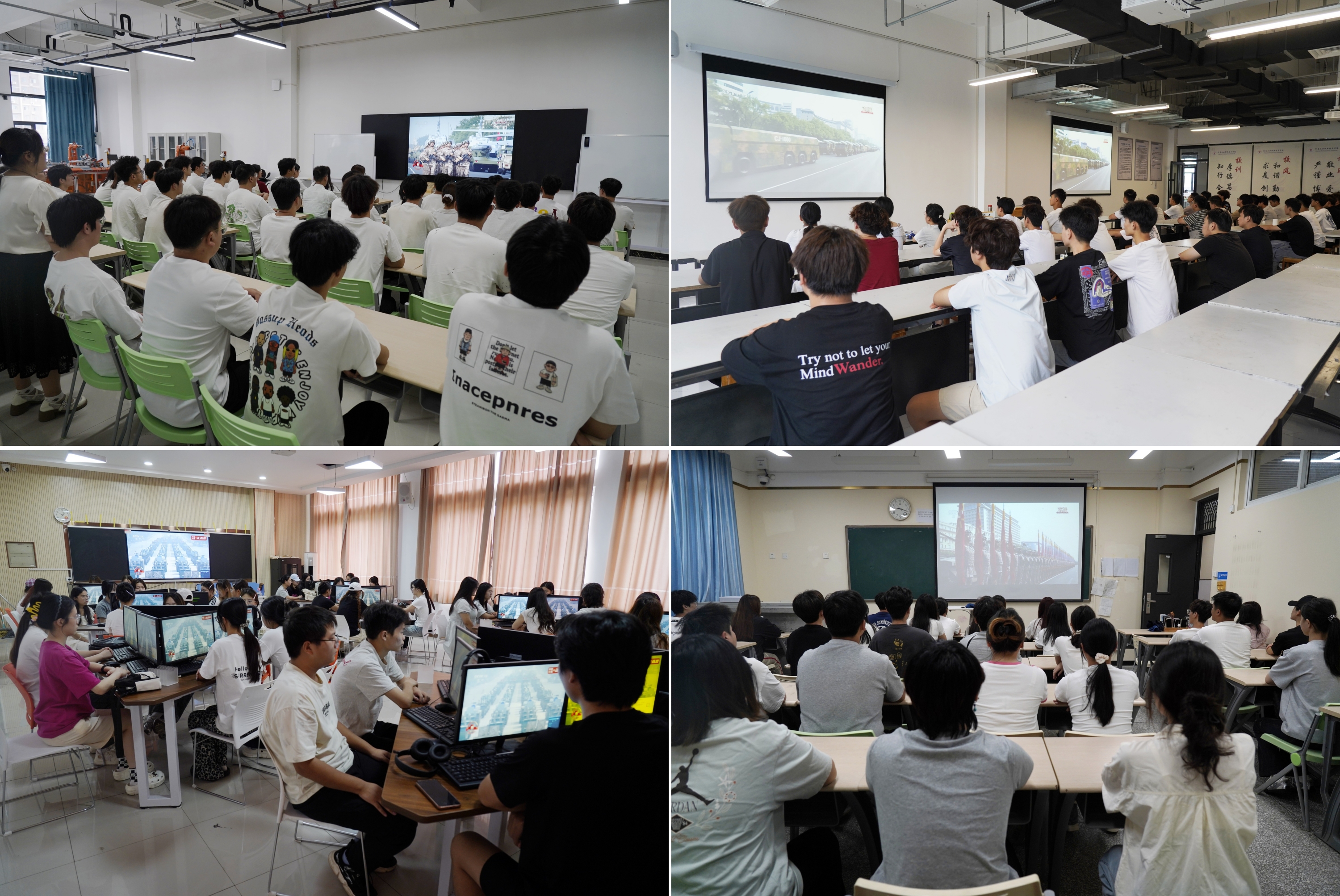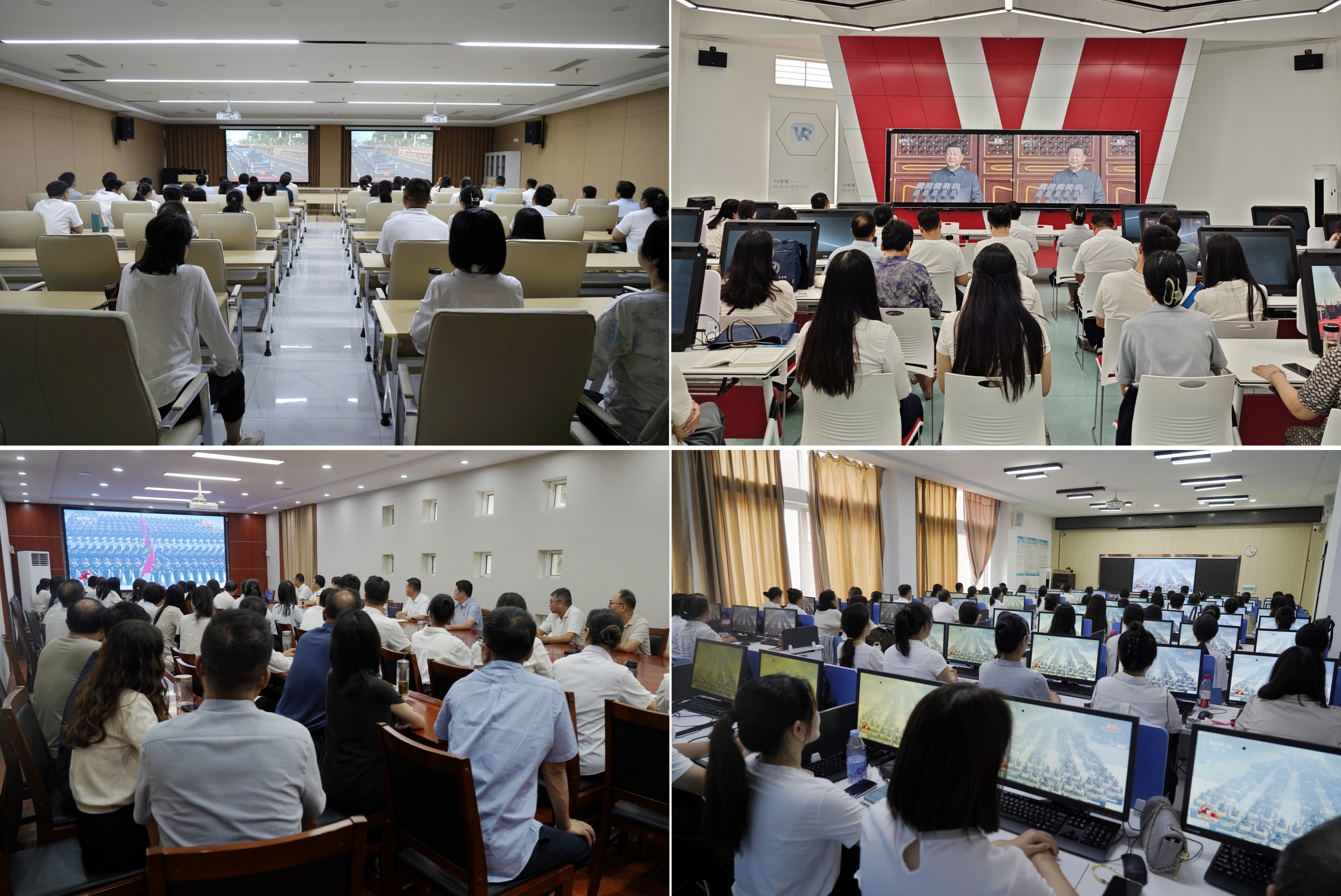 上午9时,全体师生分别在会议室、教室、报告厅等地通过电视、网络等多种形式集中观看,广大师生严肃认真、聚精会神,聆听习近平总书记的重要讲话,凝心观看阅兵仪式的每一个精彩瞬间。