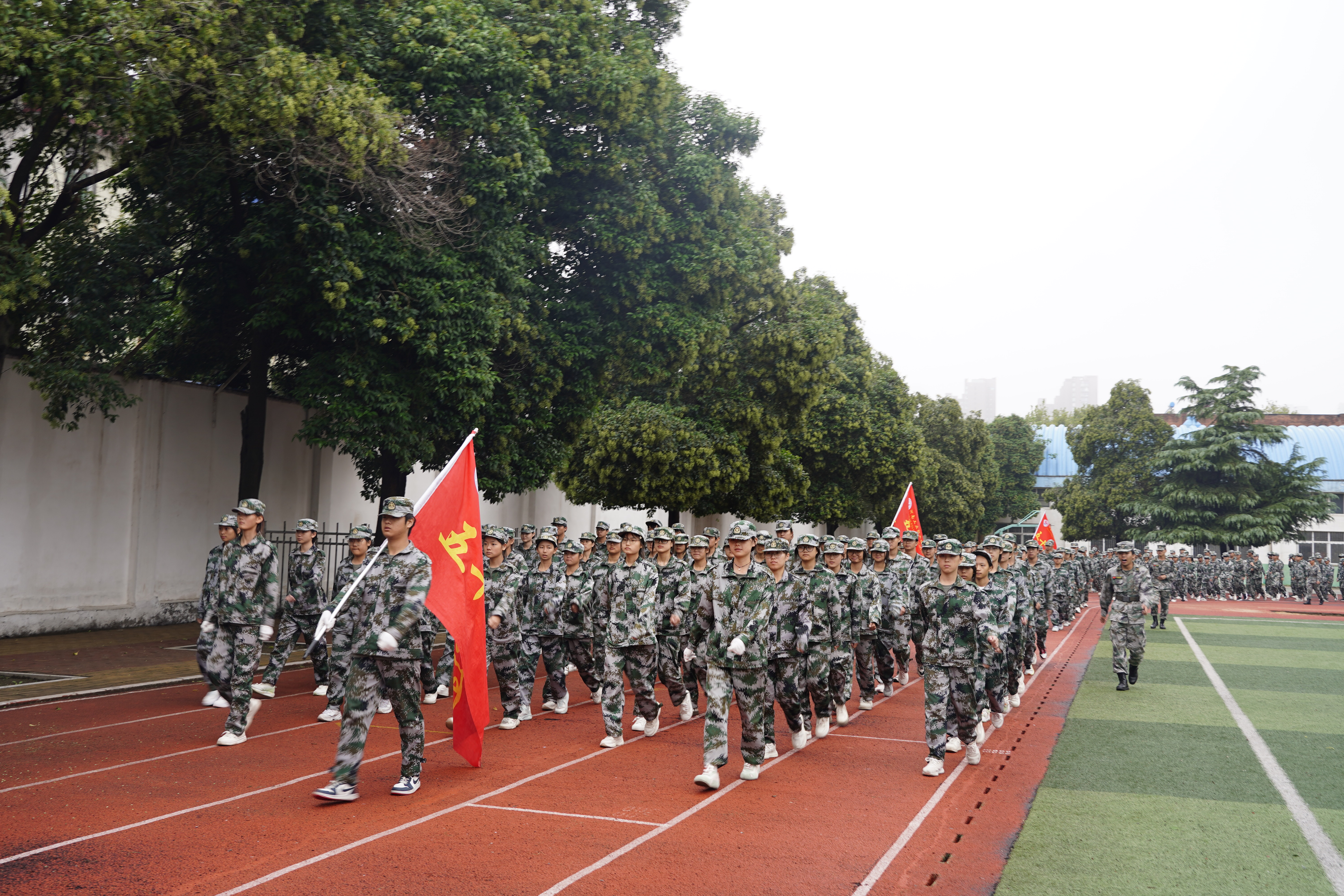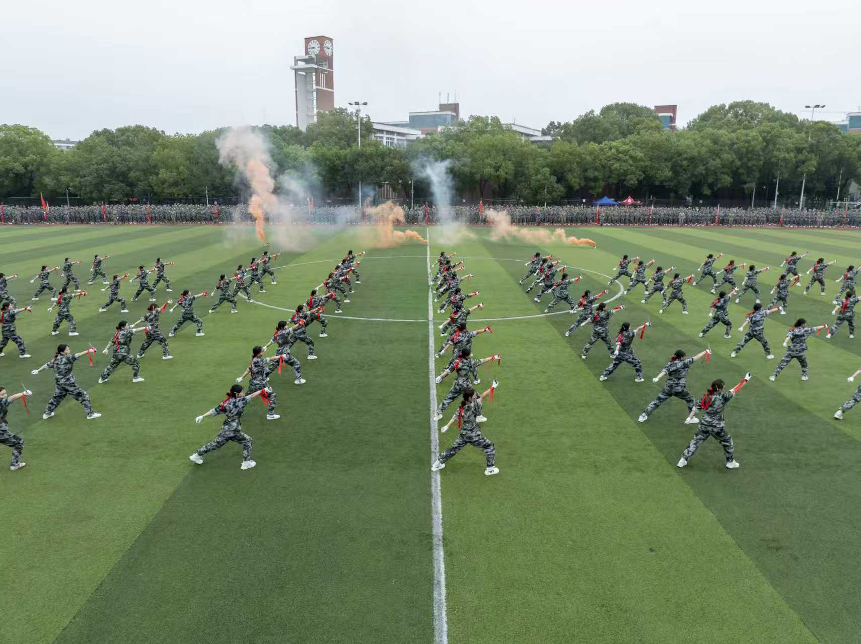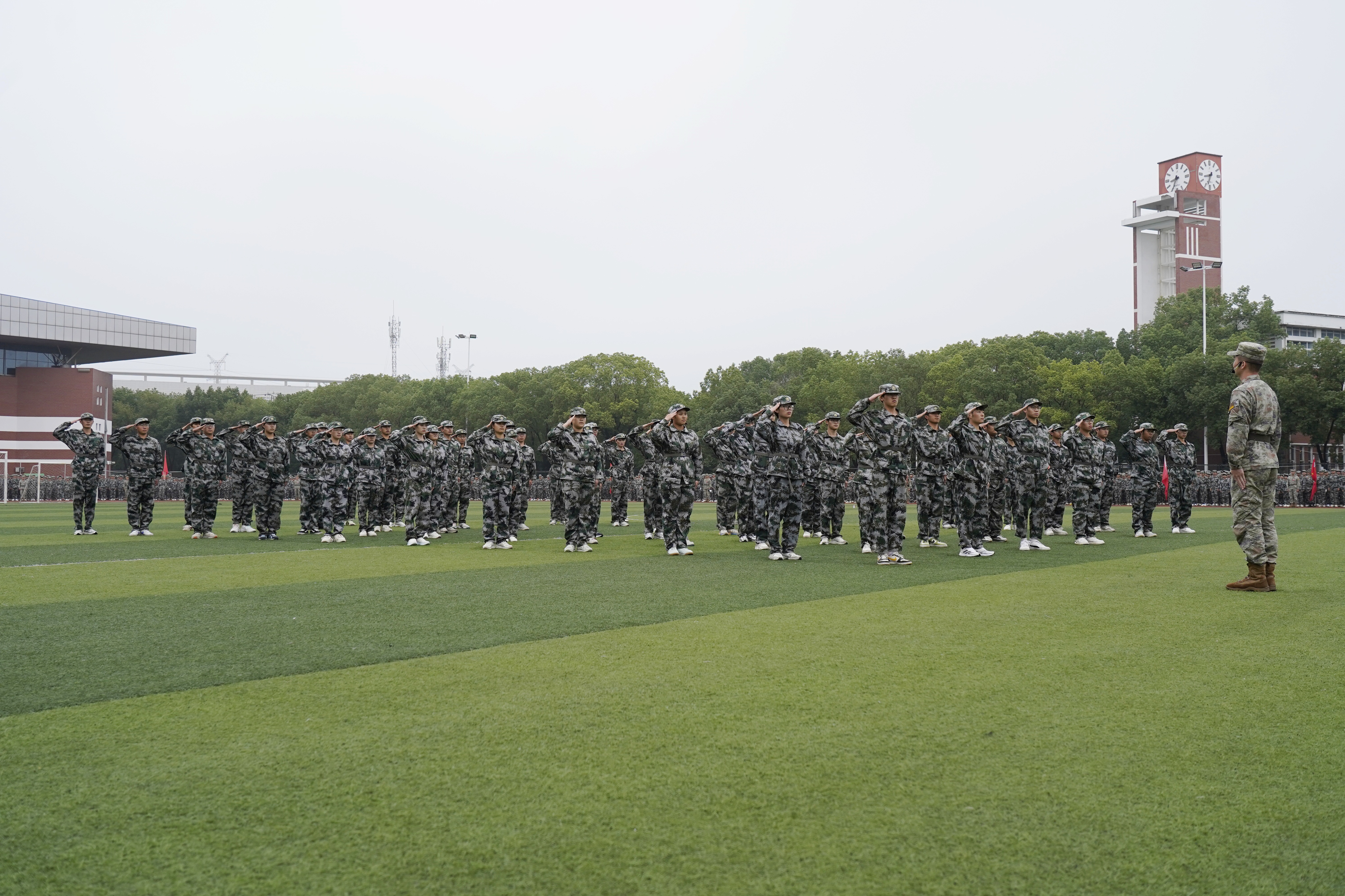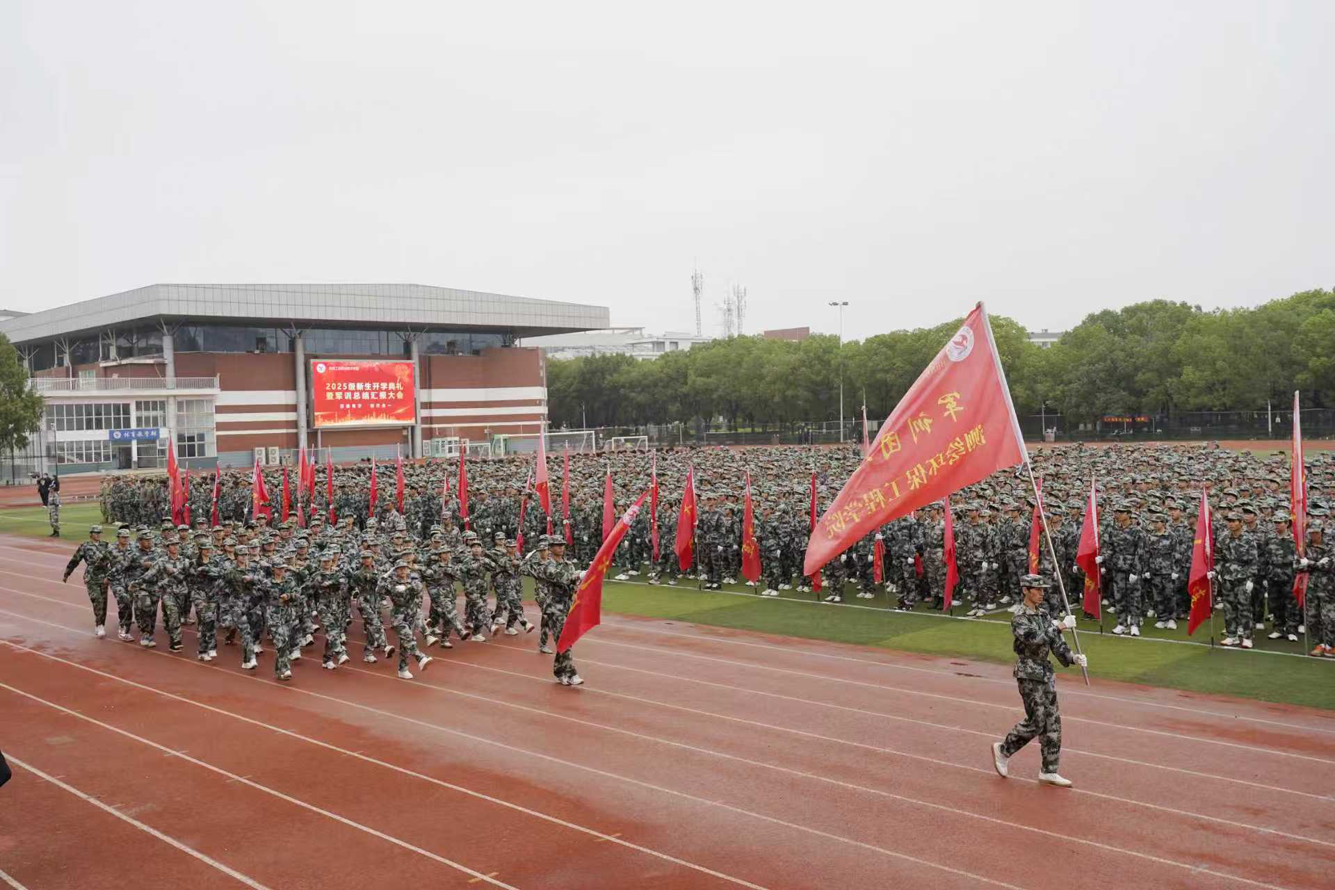 大会在庄严神圣的国歌声中拉开序幕。表演方队率先登场亮相,进行了精彩的队列展示、擒敌拳、刺杀操、匕首操等项目展示,表演方队精神抖擞、气势如虹,动作标准、铿锵有力;随后在分列式汇报表演中,60个学生方队踢着雄劲有力的正步,英姿勃发地走过主席台接受学校领导的检阅,同学们队列整齐、军姿飒爽、步伐矫健、口号洪亮,展现了我校2025级新生军训成果和同学们积极向上、团结奋进的精神风貌。