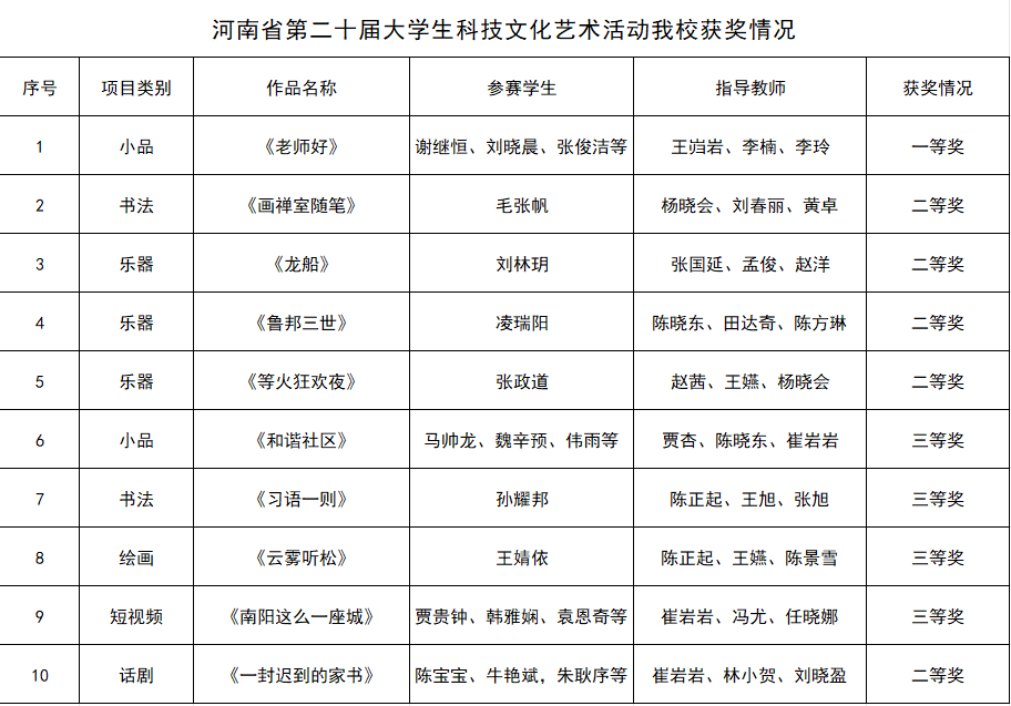 近日,中共河南省委宣传部、共青团河南省委、河南省教育厅、河南省文化和旅游厅、河南省科学技术厅、河南省体育局、河南省学生联合会联合发布了《关于公布河南省第二十届大学生科技文化艺术活动结果的通知》(豫青联字〔2025〕21 号)。我校在本次活动中共获省级荣誉10项,其中一等奖1项、二等奖5项、三等奖4项。