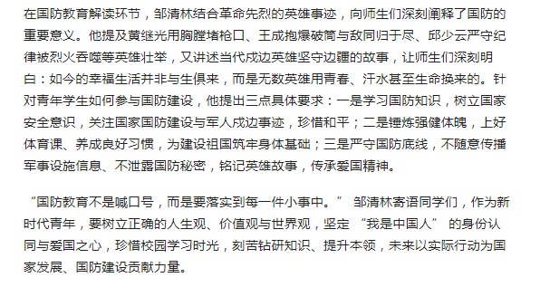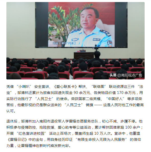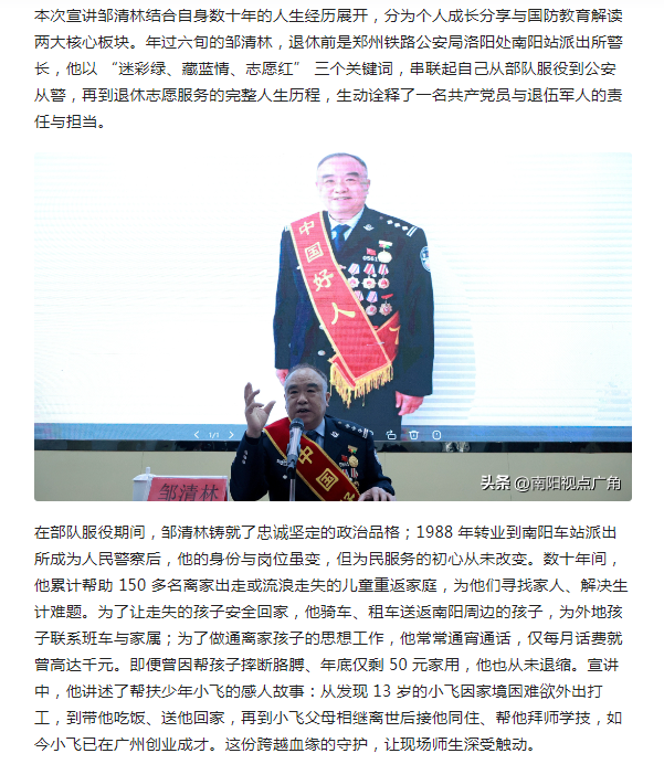 编者按:2026年3月26日,学校邀请“中国好人”邹清林走进校园,举办“弘扬雷锋精神 筑牢国防长城”主题宣讲活动,现场师生共同聆听榜样事迹,深受触动并表达了传承雷锋精神、厚植国防观念的坚定决心。近日,今日头条对学校组织的这场主题宣讲活动进行了宣传报道,展现了学校青年学子传承红色基因、勇担时代使命的青春担当。(供稿/自动化工程学院 撰稿/张文元 单位审核/王兴举 编审/赵国峰)