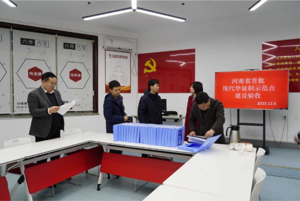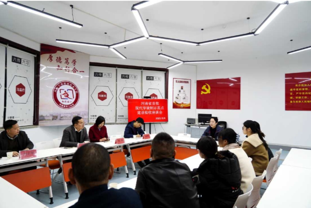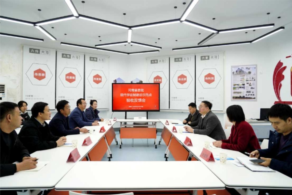 根据《河南省教育厅办公室关于开展河南省现代学徒制示范点建设工作的通知》要求, 12月6日,省教育厅专家组莅临我校开展“河南省首批现代学徒制示范点”验收工作。专家组长商丘医学高等专科学校党委副书记张松峰,专家组成员开封大学教务处长杨桦、三门峡职业技术学院教务处副处长刘丰年、郑州铁路职业技术学院教务处科长余建勇等一行4人,通过听取汇报、查看建设材料、入校实地查看、召开学生座谈会等四个环节,全面验收了我校的现代学徒示范点建设工作。我校校长王伟、副校长贾庆成,教务处、宣传部、建筑工程学院等相关负责人参加了验收工作。
