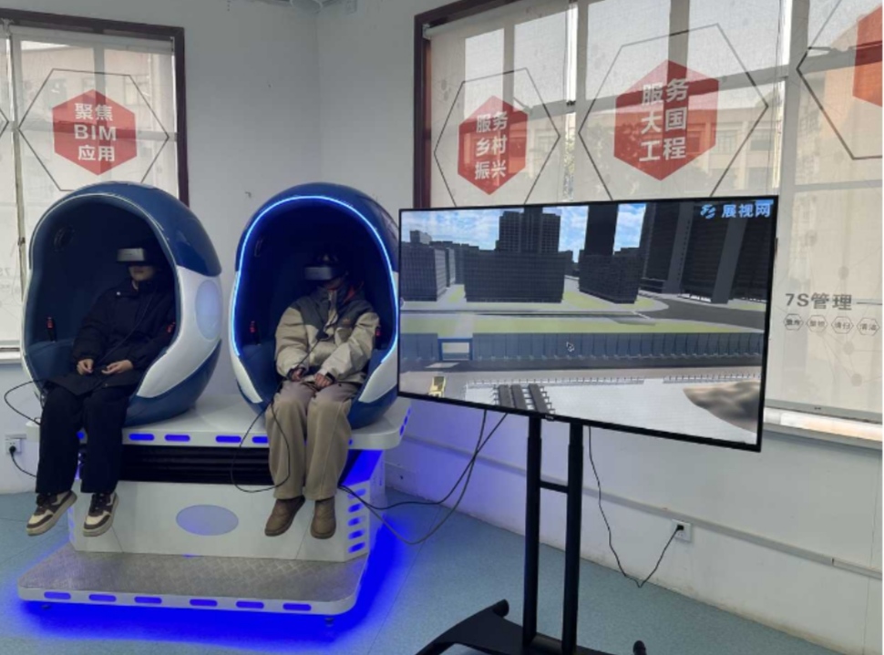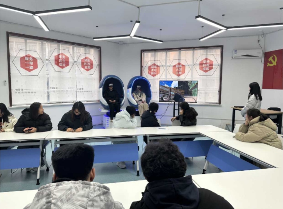 “施工安全教育”第二课堂教学活动通过理论和实践相结合的形式,由安全理论教育和虚拟仿真体验两个环节组成,不仅可以对学生的专业课程进行延伸,而且还可以培养学生的安全意识,提升学生的综合职业能力。在本次活动中,刘宇老师首先在建筑装配虚拟仿真实训室给学生详细介绍了施工现场的各项安全制度以及常见的事故场景,包括触电伤害、边坡滑坡、高空坠落、物体打击等,引导学生要牢记各项安全要点,避开现场的危险点。随后在建筑施工安全虚拟仿真体验开展虚拟实景体验,同学们坐在VR蛋椅上佩戴3D眼镜,通过操作手柄在虚拟施工场景中穿越,身临其境地体验了施工危险场景所带来的紧张与冲击,增强了安全防范和安全意识。