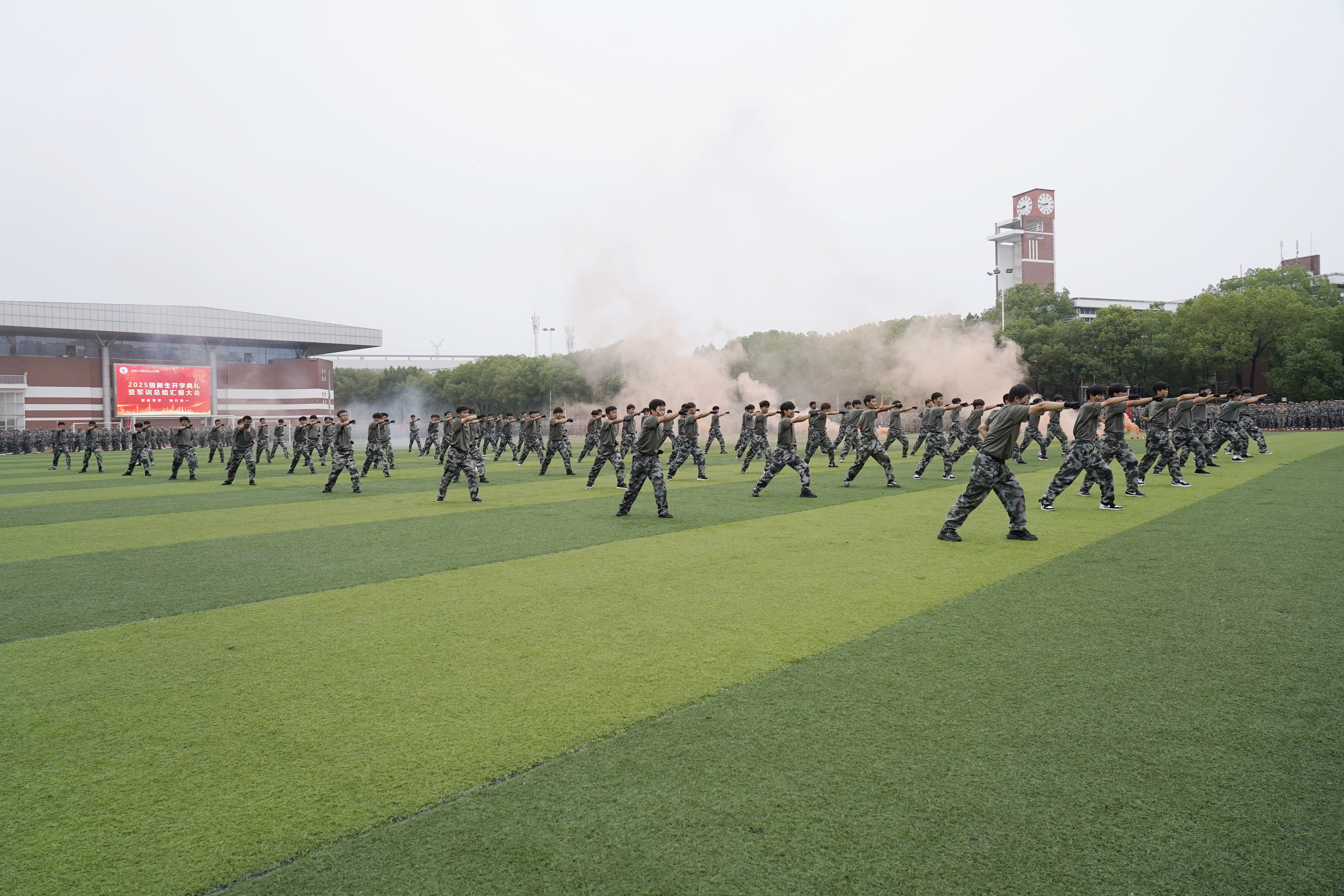 大会在庄严神圣的国歌声中拉开序幕。表演方队率先登场亮相,进行了精彩的队列展示、擒敌拳、刺杀操、匕首操等项目展示,表演方队精神抖擞、气势如虹,动作标准、铿锵有力;随后在分列式汇报表演中,60个学生方队踢着雄劲有力的正步,英姿勃发地走过主席台接受学校领导的检阅,同学们队列整齐、军姿飒爽、步伐矫健、口号洪亮,展现了我校2025级新生军训成果和同学们积极向上、团结奋进的精神风貌。