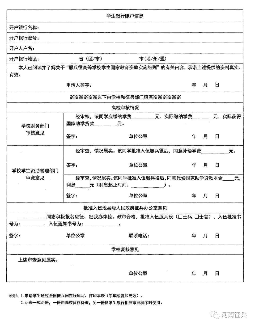 ( 四)学生将《申请表 I 》原件和《入伍通知书》复印件,寄送至原就读高校学生资助管理部门。 ( 五)高校学生资助管理部门在收到学生寄送的《申请表 I 》原件和《入伍通知书》复印件后,对各项内容进行复核,符合条件的,及时向学生进行学费补偿或国家助学贷款代偿。 对于办理高校国家助学贷款的学生,由高校按照还款计划,一次性向银行偿还学生高校国家助学贷款本息,并将银行开具的偿还贷款票据交寄学生本人或其家长。 偿还全部贷款后如有剩余资金,汇至学生指定的地址或账户。